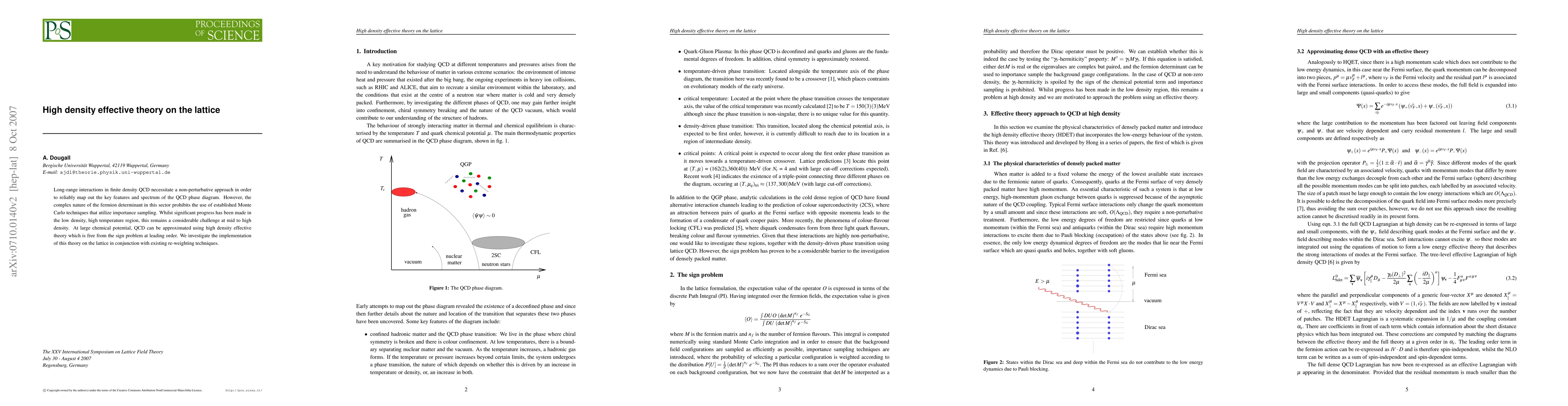 This paper explores the application of high density effective theory on a lattice to study long-range interactions in finite density QCD, addressing the challenges posed by the sign problem and proposing a non-perturbative approach to map out the QCD phase diagram at mid to high densities. The study combines this theory with re-weighting techniques to overcome existing computational limitations.