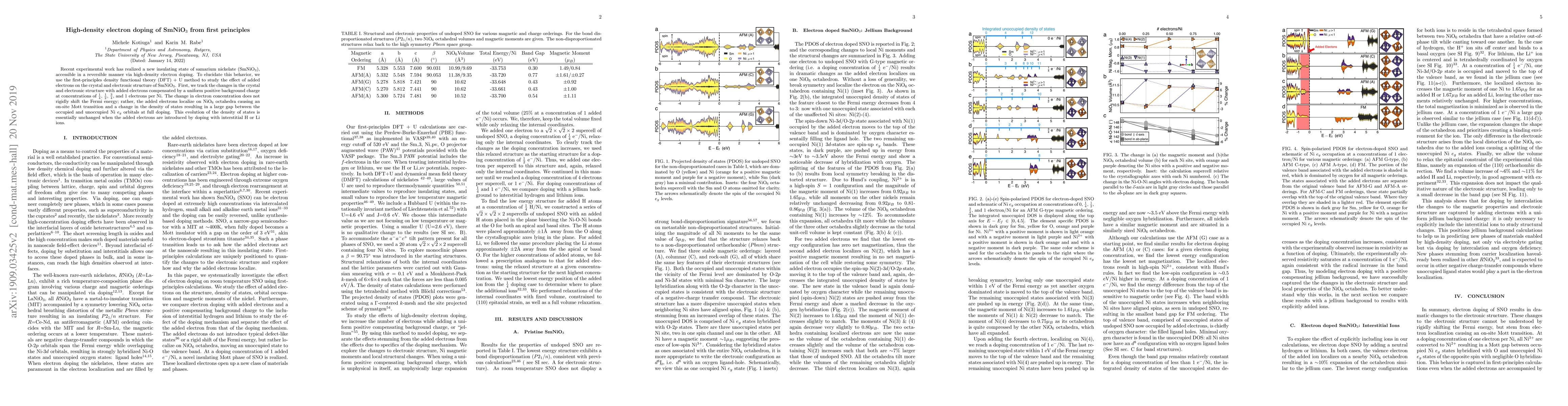 Recent experimental work has realized a new insulating state of samarium nickelate (SmNiO$_3$), accessible in a reversible manner via high-density electron doping. To elucidate this behavior, we use the first-principles density functional theory (DFT) + U method to study the effect of added electrons on the crystal and electronic structure of SmNiO$_3$. First, we track the changes in the crystal and electronic structure with added electrons compensated by a uniform positive background charge at concentrations of $\frac{1}{4}$, $\frac{1}{2}$, $\frac{3}{4}$, and 1 electrons per Ni. The change in electron concentration does not rigidly shift the Fermi energy; rather, the added electrons localize on NiO$_6$ octahedra causing an on-site Mott transition and a change in the density of states resulting in a large gap between the occupied and unoccupied Ni $e_g$ orbitals at full doping. This evolution of the density of states is essentially unchanged when the added electrons are introduced by doping with interstitial H or Li ions.