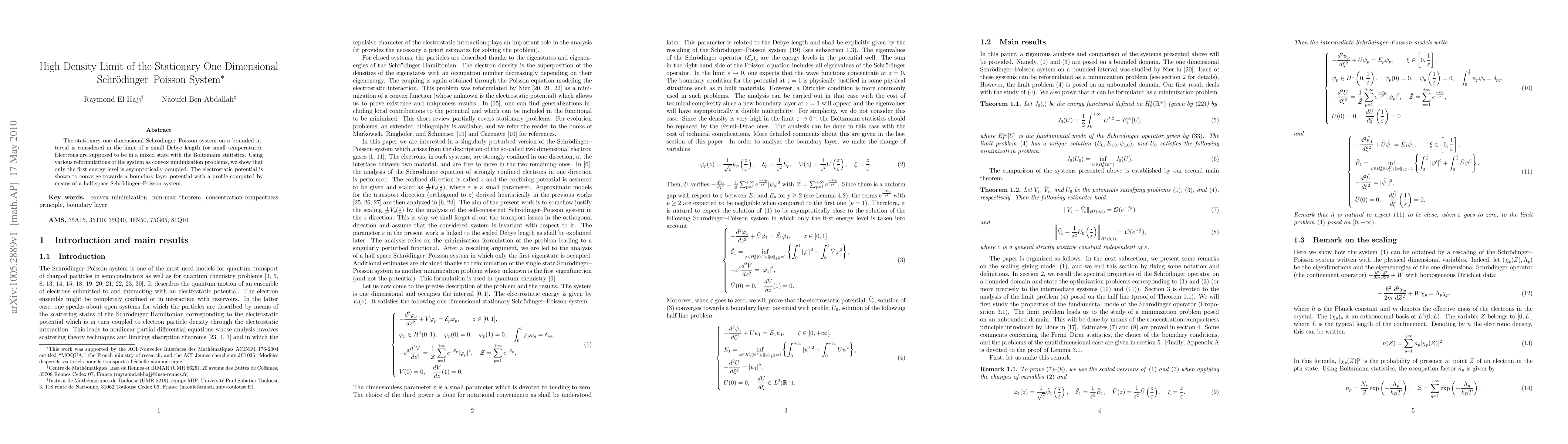 This paper investigates the high density limit of a one-dimensional Schrödinger-Poisson system, demonstrating that only the first energy level is occupied asymptotically. The electrostatic potential converges to a boundary layer potential derived from a half-space Schrödinger-Poisson system.