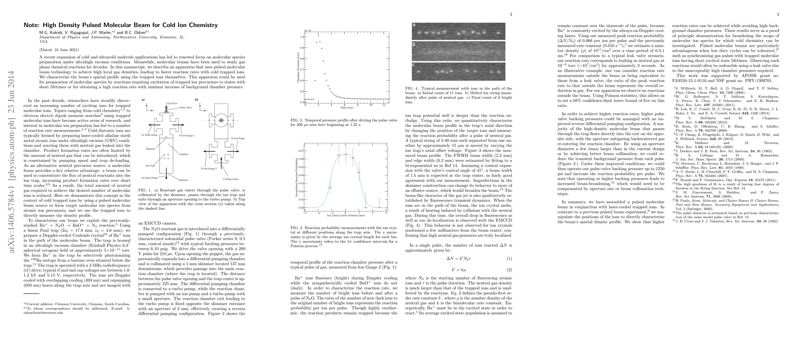 This paper details an apparatus utilizing high-density pulsed molecular beams to facilitate faster reaction rates with cold trapped ions, characterized by the spatial profile of the beam through the trapped ions themselves. The technology aims to prepare molecular species efficiently under ultrahigh vacuum conditions with minimal background pressure increase.