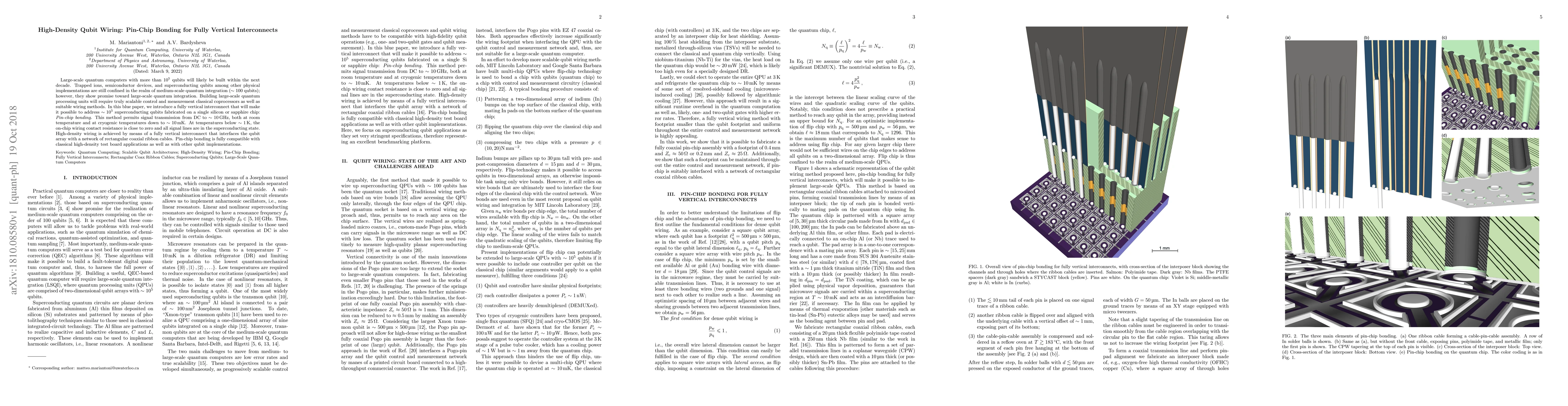 Large-scale quantum computers with more than $10^5$ qubits will likely be built within the next decade. Trapped ions, semiconductor devices, and superconducting qubits among other physical implementations are still confined in the realm of medium-scale quantum integration ($\sim 100$ qubits); however, they show promise toward large-scale quantum integration. Building large-scale quantum processing units will require truly scalable control and measurement classical coprocessors as well as suitable wiring methods. In this blue paper, we introduce a fully vertical interconnect that will make it possible to address $\sim 10^5$ superconducting qubits fabricated on a single silicon or sapphire chip: Pin-chip bonding. This method permits signal transmission from DC to $\sim 10$ GHz, both at room temperature and at cryogenic temperatures down to $\sim 10$ mK. At temperatures below $\sim 1$ K, the on-chip wiring contact resistance is close to zero and all signal lines are in the superconducting state. High-density wiring is achieved by means of a fully vertical interconnect that interfaces the qubit array with a network of rectangular coaxial ribbon cables. Pin-chip bonding is fully compatible with classical high-density test board applications as well as with other qubit implementations.
