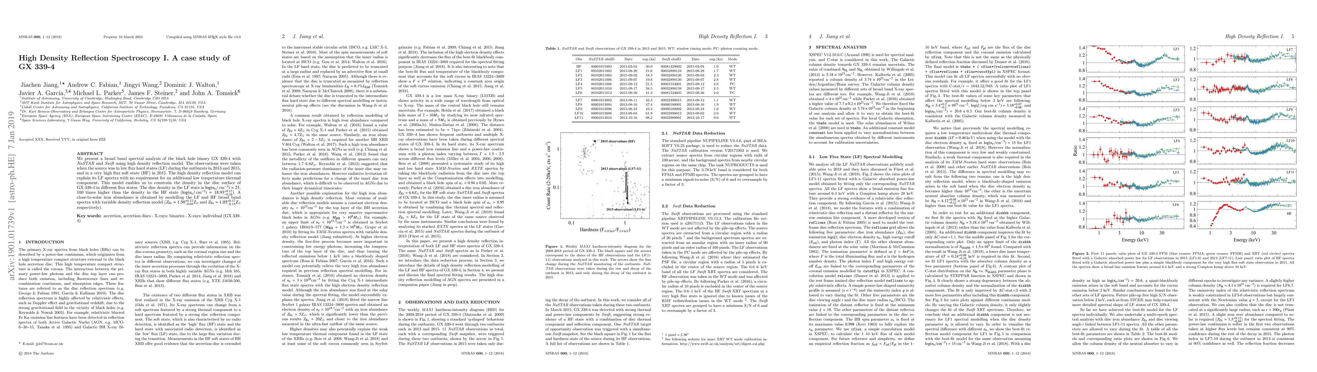 This study uses high density reflection spectroscopy with NuSTAR and Swift to analyze the black hole binary GX~339-4 in different flux states, revealing a 100-fold higher electron density in low flux states compared to high flux states. The model also indicates close-to-solar iron abundance in both states.