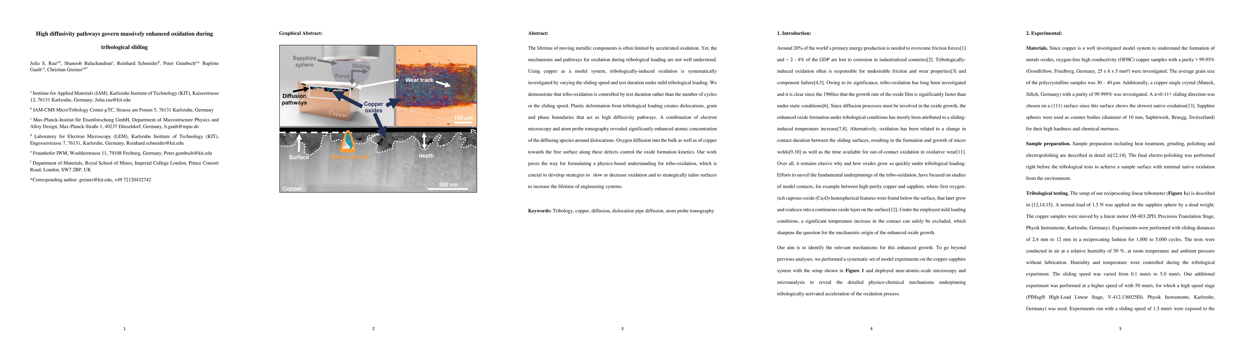 This paper investigates the mechanisms behind accelerated oxidation during tribological sliding using copper as a model system, finding that oxidation is primarily governed by test duration rather than sliding speed. High diffusivity pathways created by plastic deformation, such as dislocations and grain boundaries, significantly enhance the diffusion of oxygen and copper, controlling the oxidation kinetics.