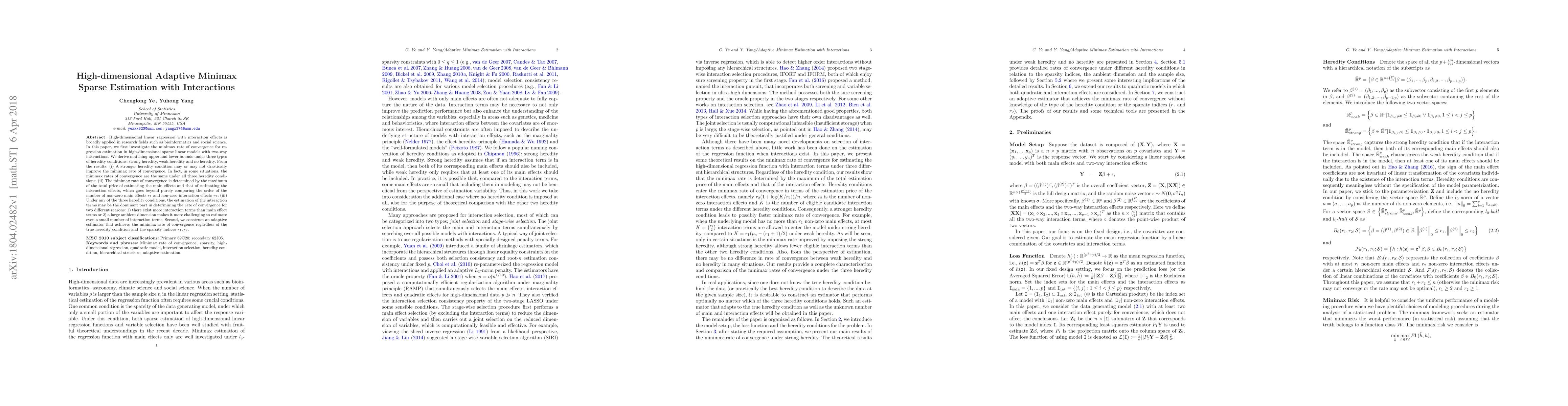 This paper investigates the minimax rate of convergence for high-dimensional sparse linear regression models with two-way interactions, deriving matching upper and lower bounds under different heredity conditions. It finds that the minimax rate is determined by the maximum price of estimating main and interaction effects, and constructs an adaptive estimator achieving the minimax rate regardless of the true heredity condition and sparsity indices.