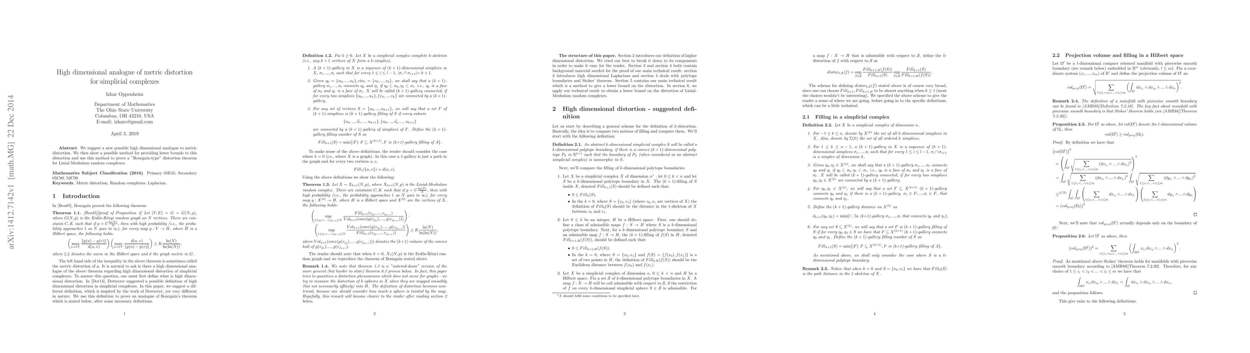 Researchers propose a high-dimensional analogue of metric distortion for simplicial complexes and use it to prove a