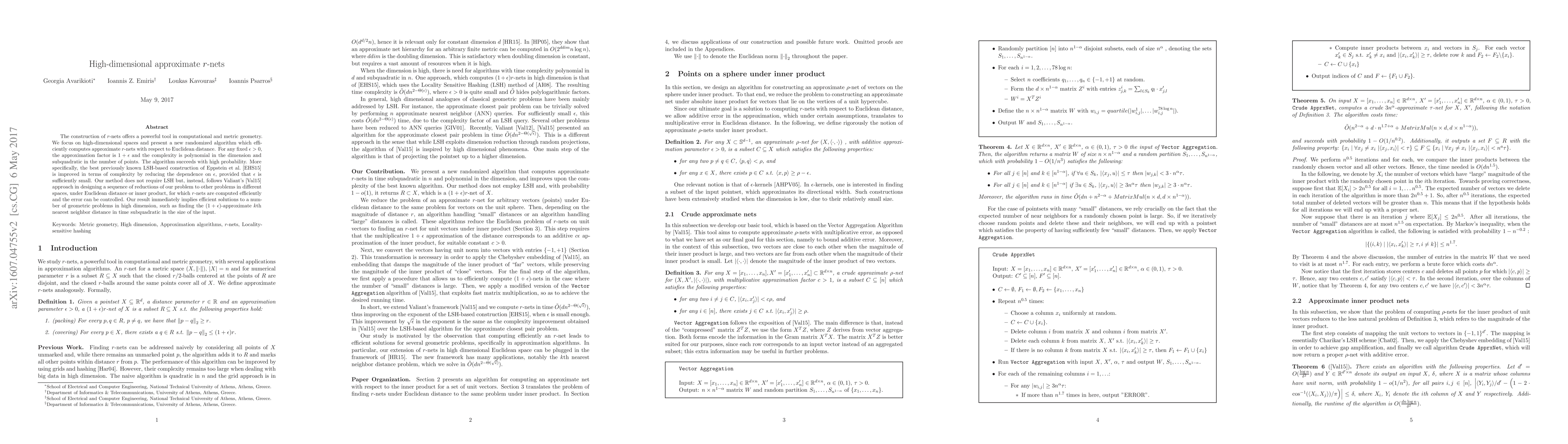 The construction of $r$-nets offers a powerful tool in computational and metric geometry. We focus on high-dimensional spaces and present a new randomized algorithm which efficiently computes approximate $r$-nets with respect to Euclidean distance. For any fixed $\epsilon>0$, the approximation factor is $1+\epsilon$ and the complexity is polynomial in the dimension and subquadratic in the number of points. The algorithm succeeds with high probability. More specifically, the best previously known LSH-based construction of Eppstein et al.\ \cite{EHS15} is improved in terms of complexity by reducing the dependence on $\epsilon$, provided that $\epsilon$ is sufficiently small. Our method does not require LSH but, instead, follows Valiant's \cite{Val15} approach in designing a sequence of reductions of our problem to other problems in different spaces, under Euclidean distance or inner product, for which $r$-nets are computed efficiently and the error can be controlled. Our result immediately implies efficient solutions to a number of geometric problems in high dimension, such as finding the $(1+\epsilon)$-approximate $k$th nearest neighbor distance in time subquadratic in the size of the input.