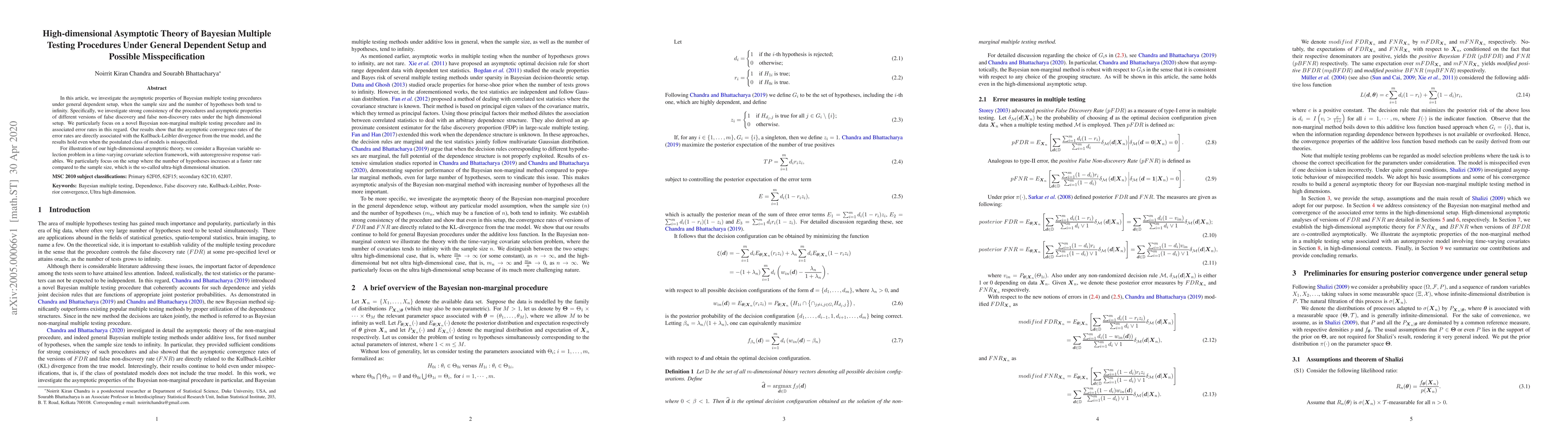 In this article, we investigate the asymptotic properties of Bayesian multiple testing procedures under general dependent setup, when the sample size and the number of hypotheses both tend to infinity. Specifically, we investigate strong consistency of the procedures and asymptotic properties of different versions of false discovery and false non-discovery rates under the high dimensional setup. We particularly focus on a novel Bayesian non-marginal multiple testing procedure and its associated error rates in this regard. Our results show that the asymptotic convergence rates of the error rates are directly associated with the Kullback-Leibler divergence from the true model, and the results hold even when the postulated class of models is misspecified. For illustration of our high-dimensional asymptotic theory, we consider a Bayesian variable selection problem in a time-varying covariate selection framework, with autoregressive response variables. We particularly focus on the setup where the number of hypotheses increases at a faster rate compared to the sample size, which is the so-called ultra-high dimensional situation.