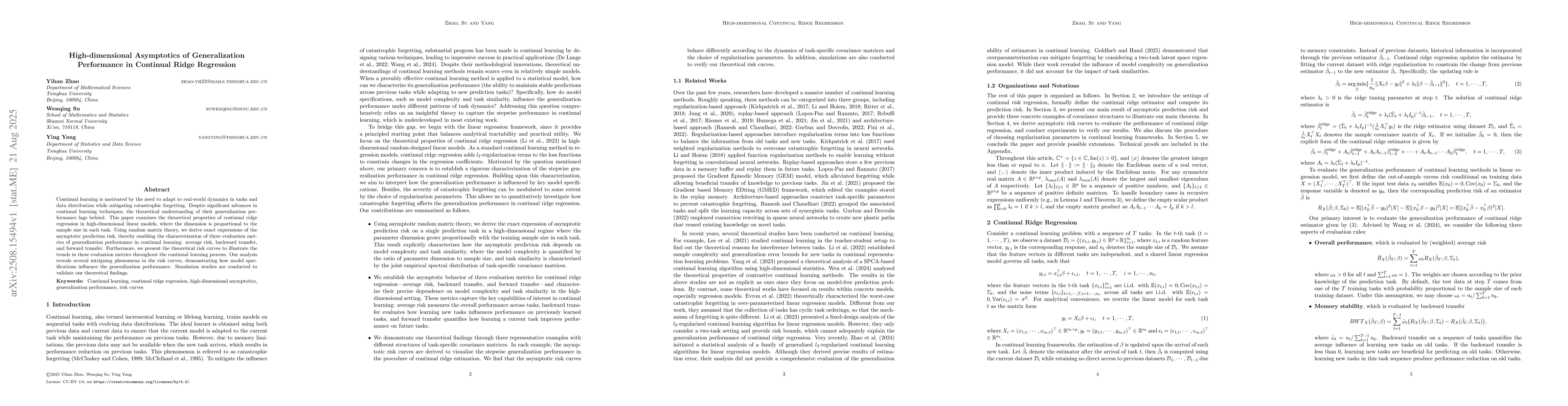Continual learning is motivated by the need to adapt to real-world dynamics in tasks and data distribution while mitigating catastrophic forgetting. Despite significant advances in continual learning techniques, the theoretical understanding of their generalization performance lags behind. This paper examines the theoretical properties of continual ridge regression in high-dimensional linear models, where the dimension is proportional to the sample size in each task. Using random matrix theory, we derive exact expressions of the asymptotic prediction risk, thereby enabling the characterization of three evaluation metrics of generalization performance in continual learning: average risk, backward transfer, and forward transfer. Furthermore, we present the theoretical risk curves to illustrate the trends in these evaluation metrics throughout the continual learning process. Our analysis reveals several intriguing phenomena in the risk curves, demonstrating how model specifications influence the generalization performance. Simulation studies are conducted to validate our theoretical findings.