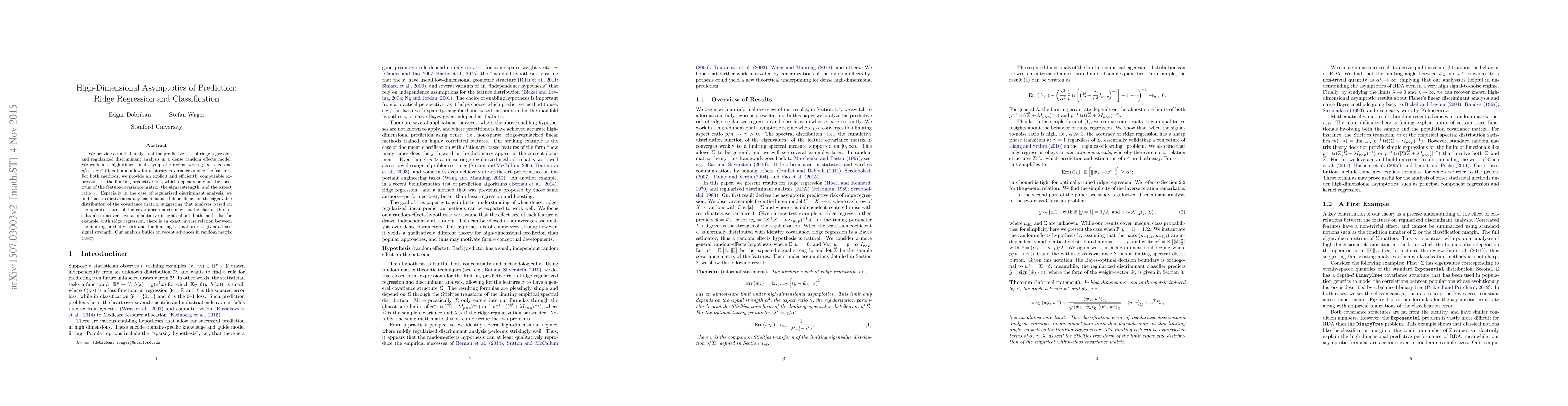 This paper offers a unified analysis of ridge regression and regularized discriminant analysis in high-dimensional settings, deriving explicit expressions for their predictive risks that depend on feature covariance, signal strength, and the aspect ratio. It reveals nuanced dependencies in predictive accuracy, especially for regularized discriminant analysis, and highlights an inverse relation between predictive and estimation risks in ridge regression.
