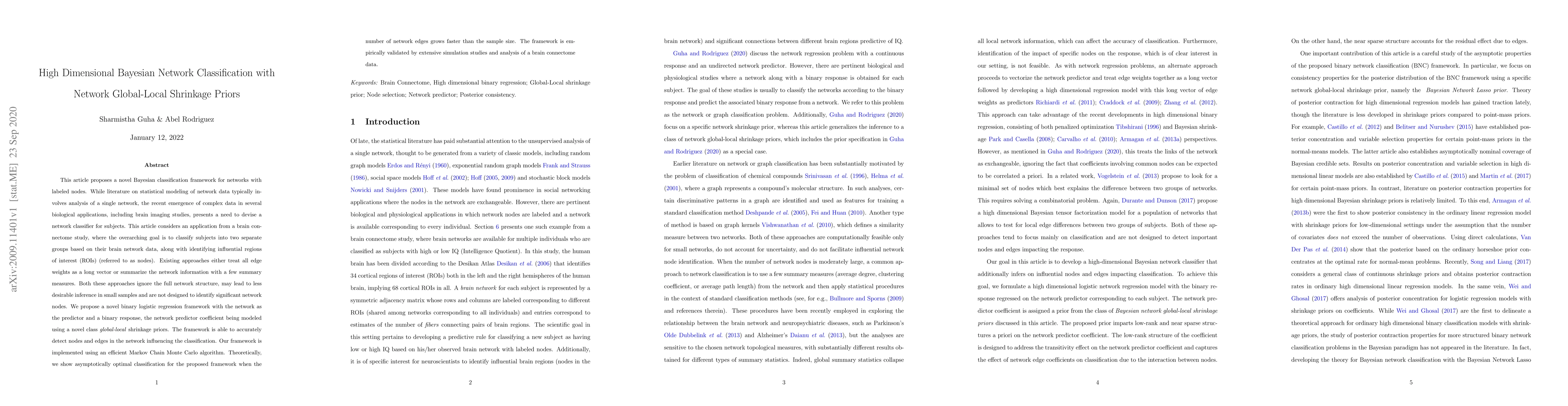 This article proposes a novel Bayesian classification framework for networks with labeled nodes. While literature on statistical modeling of network data typically involves analysis of a single network, the recent emergence of complex data in several biological applications, including brain imaging studies, presents a need to devise a network classifier for subjects. This article considers an application from a brain connectome study, where the overarching goal is to classify subjects into two separate groups based on their brain network data, along with identifying influential regions of interest (ROIs) (referred to as nodes). Existing approaches either treat all edge weights as a long vector or summarize the network information with a few summary measures. Both these approaches ignore the full network structure, may lead to less desirable inference in small samples and are not designed to identify significant network nodes. We propose a novel binary logistic regression framework with the network as the predictor and a binary response, the network predictor coefficient being modeled using a novel class global-local shrinkage priors. The framework is able to accurately detect nodes and edges in the network influencing the classification. Our framework is implemented using an efficient Markov Chain Monte Carlo algorithm. Theoretically, we show asymptotically optimal classification for the proposed framework when the number of network edges grows faster than the sample size. The framework is empirically validated by extensive simulation studies and analysis of a brain connectome data.