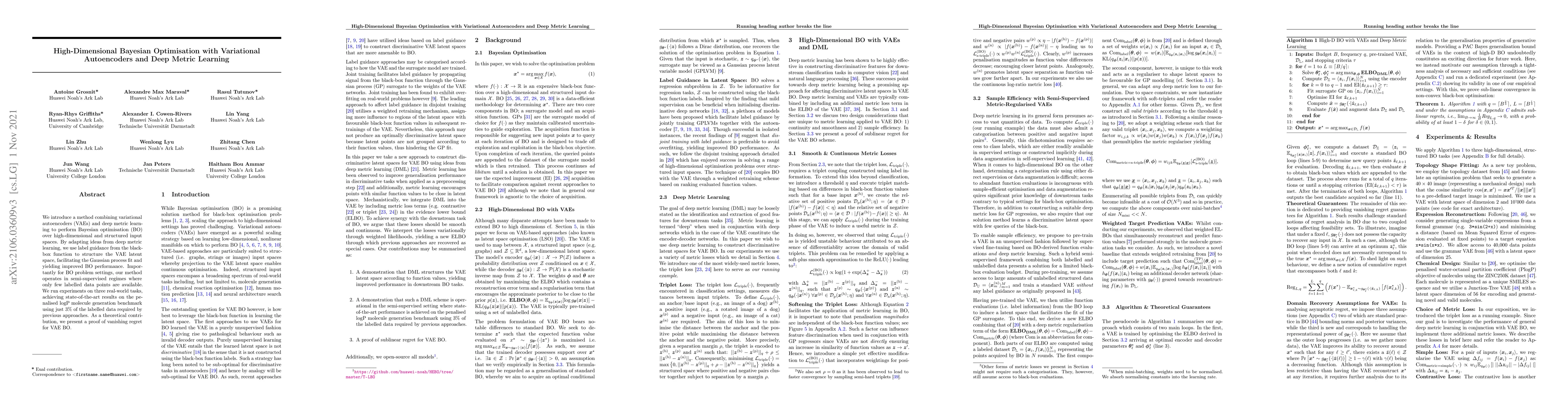 We introduce a method combining variational autoencoders (VAEs) and deep metric learning to perform Bayesian optimisation (BO) over high-dimensional and structured input spaces. By adapting ideas from deep metric learning, we use label guidance from the blackbox function to structure the VAE latent space, facilitating the Gaussian process fit and yielding improved BO performance. Importantly for BO problem settings, our method operates in semi-supervised regimes where only few labelled data points are available. We run experiments on three real-world tasks, achieving state-of-the-art results on the penalised logP molecule generation benchmark using just 3% of the labelled data required by previous approaches. As a theoretical contribution, we present a proof of vanishing regret for VAE BO.