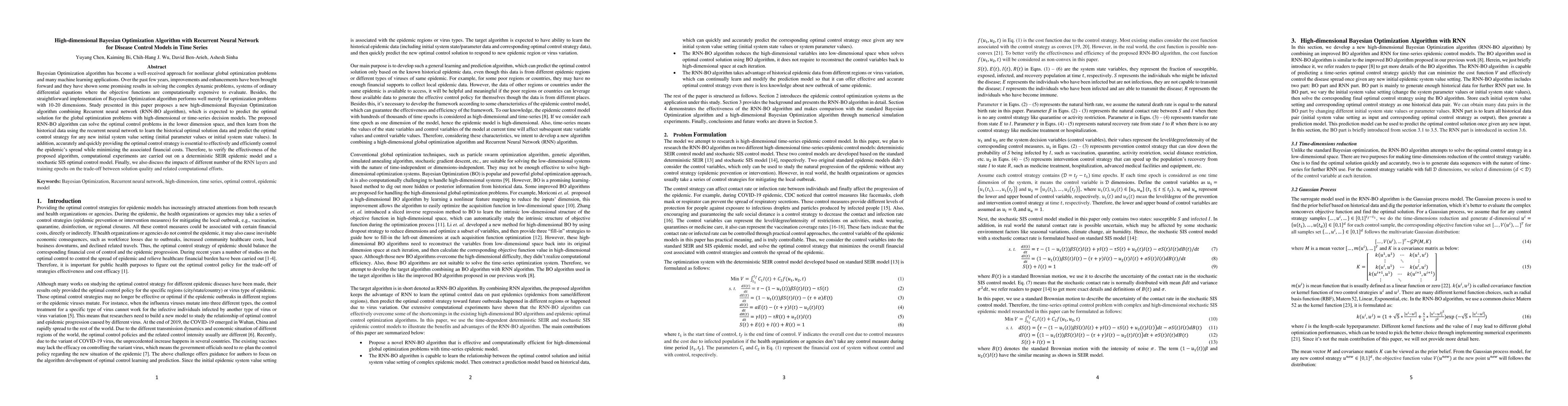 This paper proposes a high-dimensional Bayesian Optimization algorithm enhanced with Recurrent Neural Networks (RNN-BO) to solve complex dynamic optimization problems, particularly for disease control models in time series. The RNN-BO algorithm effectively predicts optimal control strategies by learning from historical data and is validated through experiments on SEIR and SIS epidemic models.