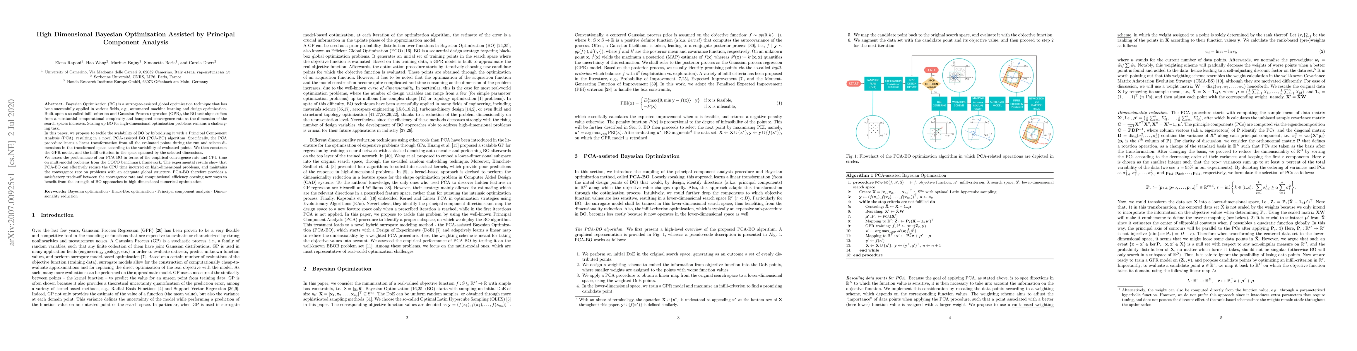 Bayesian Optimization (BO) is a surrogate-assisted global optimization technique that has been successfully applied in various fields, e.g., automated machine learning and design optimization. Built upon a so-called infill-criterion and Gaussian Process regression (GPR), the BO technique suffers from a substantial computational complexity and hampered convergence rate as the dimension of the search spaces increases. Scaling up BO for high-dimensional optimization problems remains a challenging task. In this paper, we propose to tackle the scalability of BO by hybridizing it with a Principal Component Analysis (PCA), resulting in a novel PCA-assisted BO (PCA-BO) algorithm. Specifically, the PCA procedure learns a linear transformation from all the evaluated points during the run and selects dimensions in the transformed space according to the variability of evaluated points. We then construct the GPR model, and the infill-criterion in the space spanned by the selected dimensions. We assess the performance of our PCA-BO in terms of the empirical convergence rate and CPU time on multi-modal problems from the COCO benchmark framework. The experimental results show that PCA-BO can effectively reduce the CPU time incurred on high-dimensional problems, and maintains the convergence rate on problems with an adequate global structure. PCA-BO therefore provides a satisfactory trade-off between the convergence rate and computational efficiency opening new ways to benefit from the strength of BO approaches in high dimensional numerical optimization.