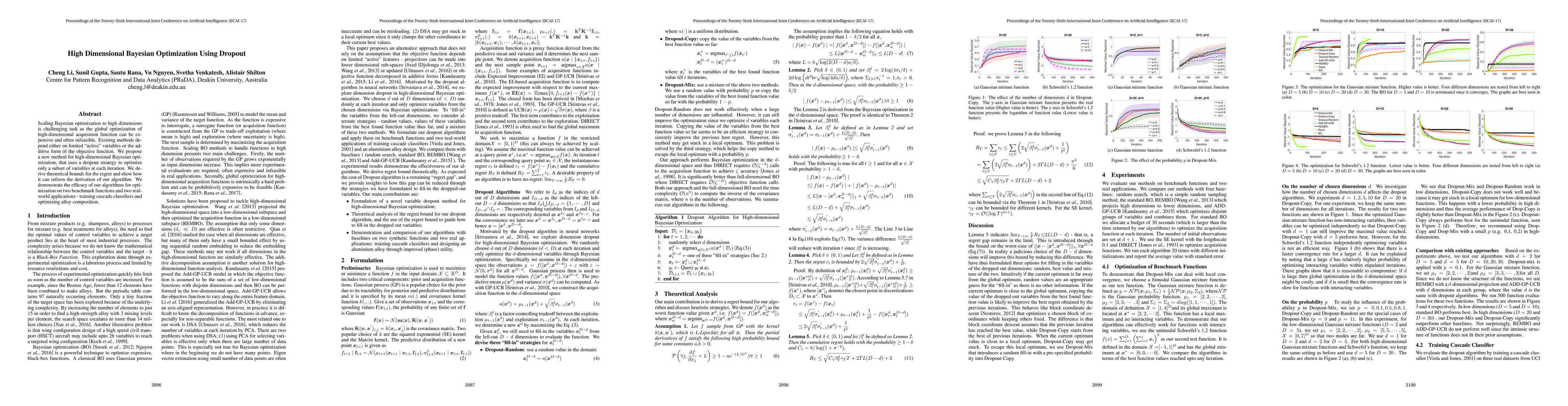 This paper proposes a novel high-dimensional Bayesian optimization method using a dropout strategy to optimize only a subset of variables at each iteration, addressing the computational challenges of global optimization. The authors derive theoretical regret bounds and demonstrate the algorithm's effectiveness on benchmark functions and real-world applications.