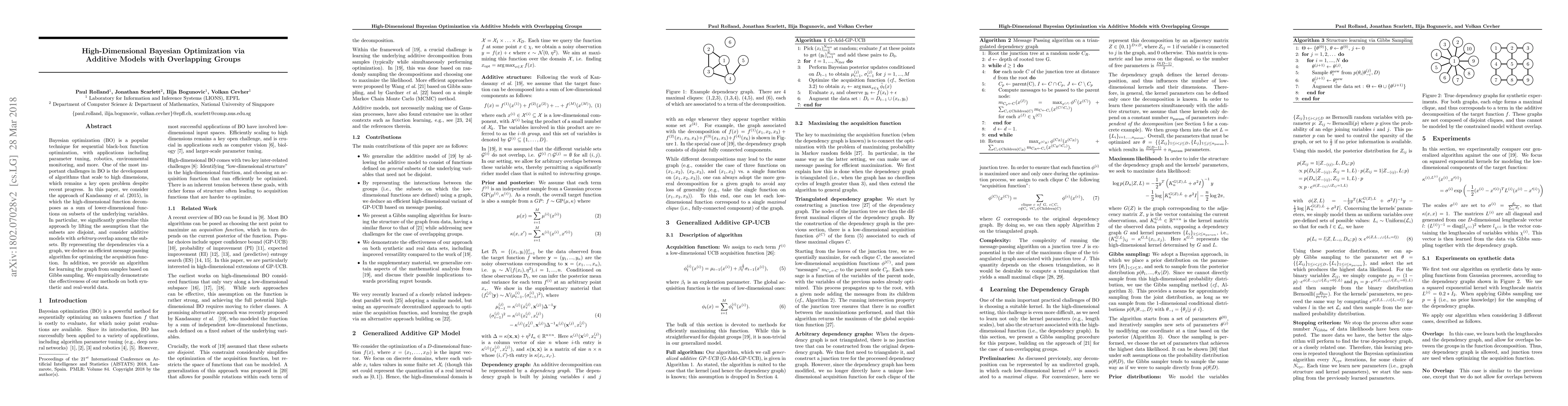 This paper proposes a scalable Bayesian optimization method for high-dimensional functions by using additive models with overlapping groups, generalizing previous disjoint subset approaches. It introduces an efficient message passing algorithm and a Gibbs sampling-based method for learning the dependency graph, demonstrating effectiveness on synthetic and real-world data.