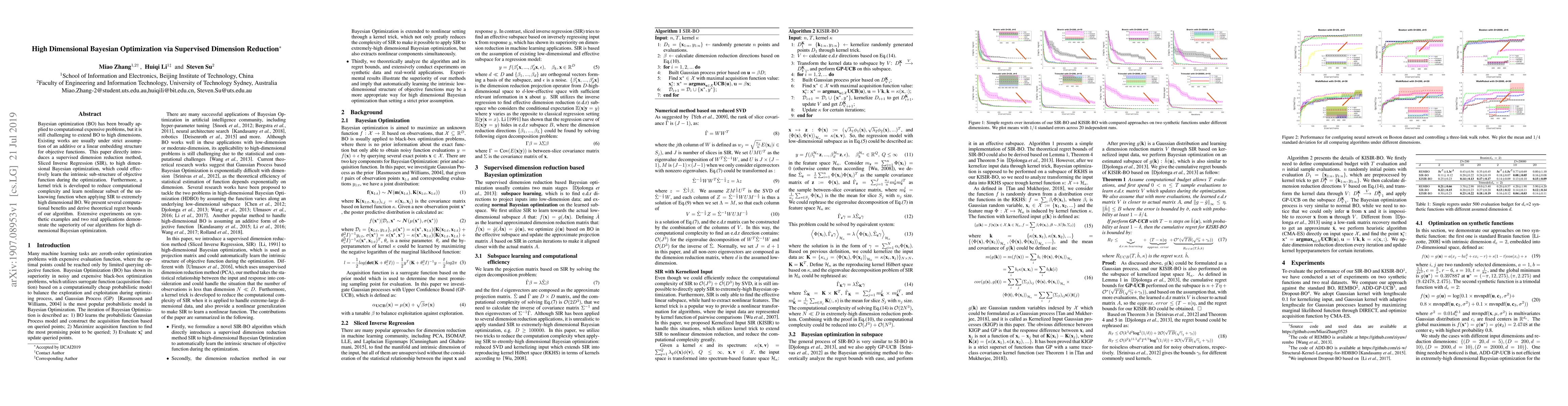 A new method called Sliced Inverse Regression (SIR) is introduced to apply Bayesian optimization in high dimensions, leveraging supervised dimension reduction to learn the intrinsic structure of objective functions.