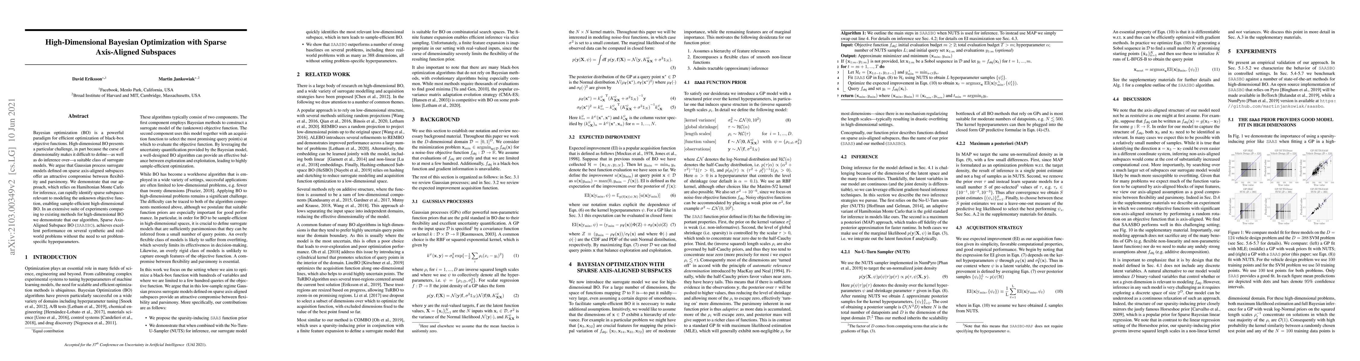 This paper proposes a high-dimensional Bayesian optimization method using Gaussian processes on sparse axis-aligned subspaces to tackle the curse of dimensionality. The method, SAASBO, efficiently identifies relevant subspaces and achieves superior performance compared to existing methods without requiring problem-specific hyperparameters.