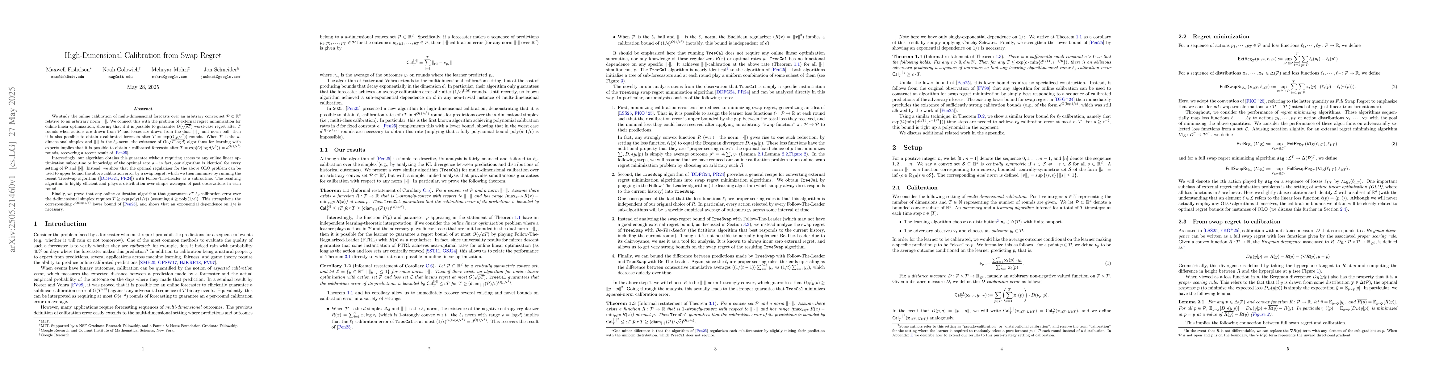 The paper connects high-dimensional forecast calibration with external regret minimization for online linear optimization, proposing an algorithm that utilizes swap regret to achieve calibration without needing access to OLO subroutines or knowledge of the optimal rate ρ.