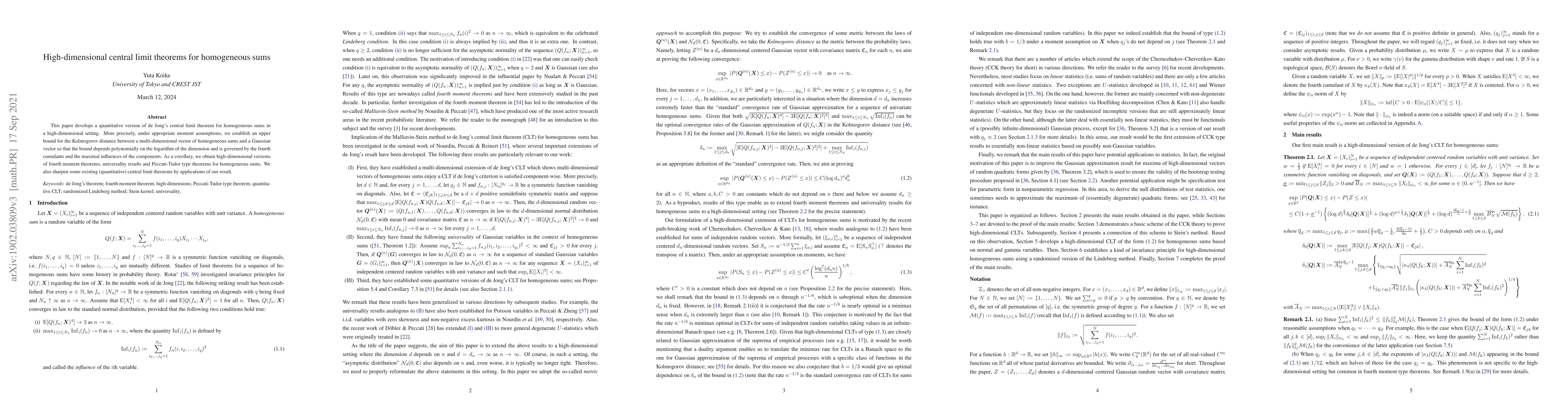 This paper establishes a quantitative high-dimensional central limit theorem for homogeneous sums, providing an upper bound for the Kolmogorov distance to a Gaussian vector that depends on the dimension and fourth cumulants. It also extends fourth moment theorems and sharpens existing central limit theorems.