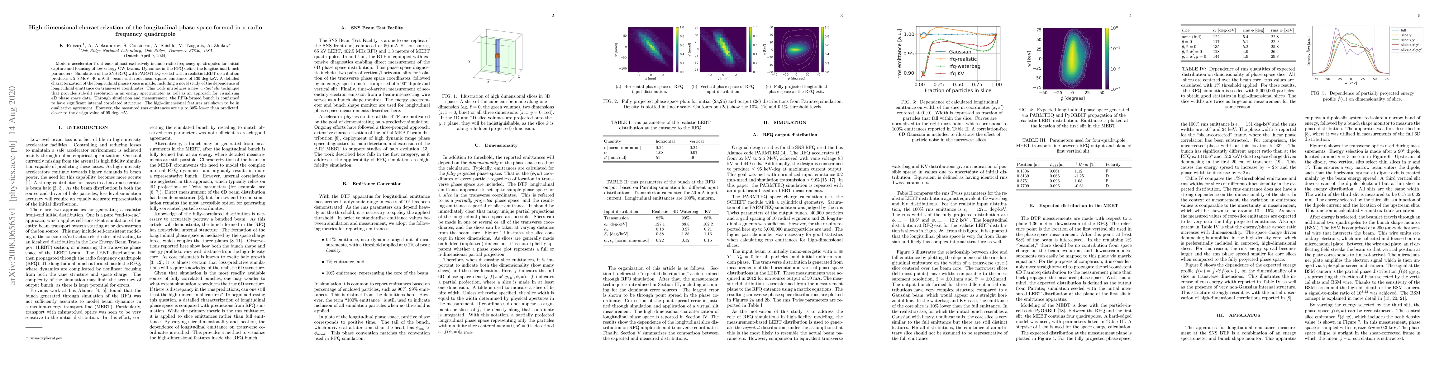 Modern accelerator front ends almost exclusively include radio-frequency quadrupoles for initial capture and focusing of the low-energy beam. Dynamics in the RFQ define the longitudinal bunch parameters. Simulation of the SNS RFQ with PARMTEQ seeded with a realistic LEBT distribution produces a 2.5 MeV, 40 mA H- beam with root-mean-square emittance of 130 deg-keV. In measurement, a detailed characterization of the longitudinal phase space is made, including a novel study of the dependence of longitudinal emittance on transverse coordinates. This work introduces a new virtual slit technique that provides sub-slit resolution in an energy spectrometer as well as an approach for visualizing 4D phase space data. Through simulation and measurement, the RFQ-formed bunch is confirmed to have significant internal correlated structure. The high-dimensional features are shown to be in qualitative agreement. However, the measured rms emittances are up to 30% lower than predicted, closer to the design value of 95 deg-keV.