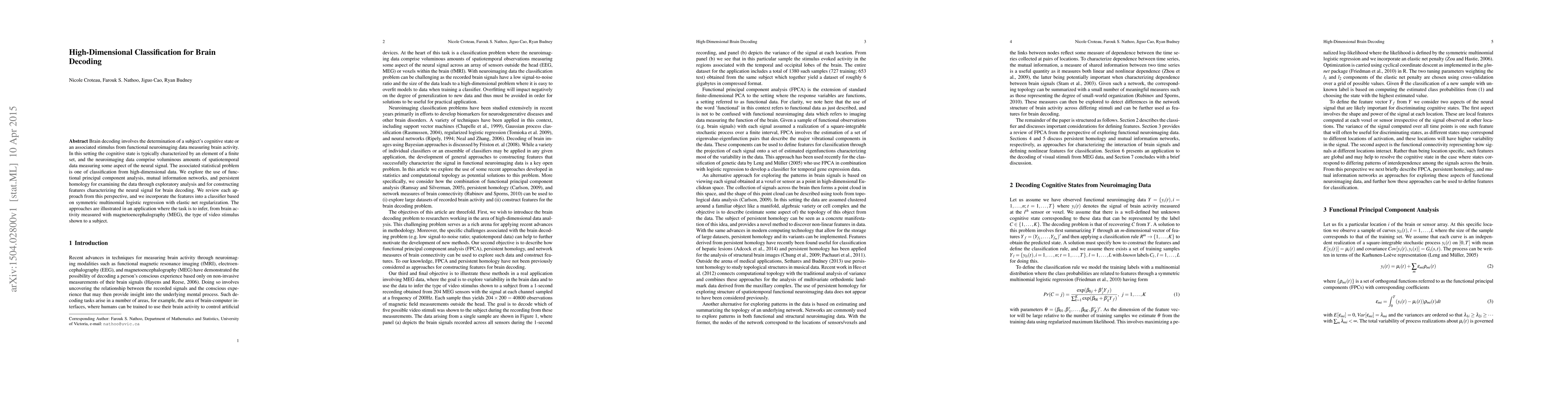 This study explores new methods for brain decoding, including functional principal component analysis and persistent homology, to classify high-dimensional neural data from magnetoencephalography. The approach combines these techniques with machine learning to accurately predict cognitive states or stimuli.