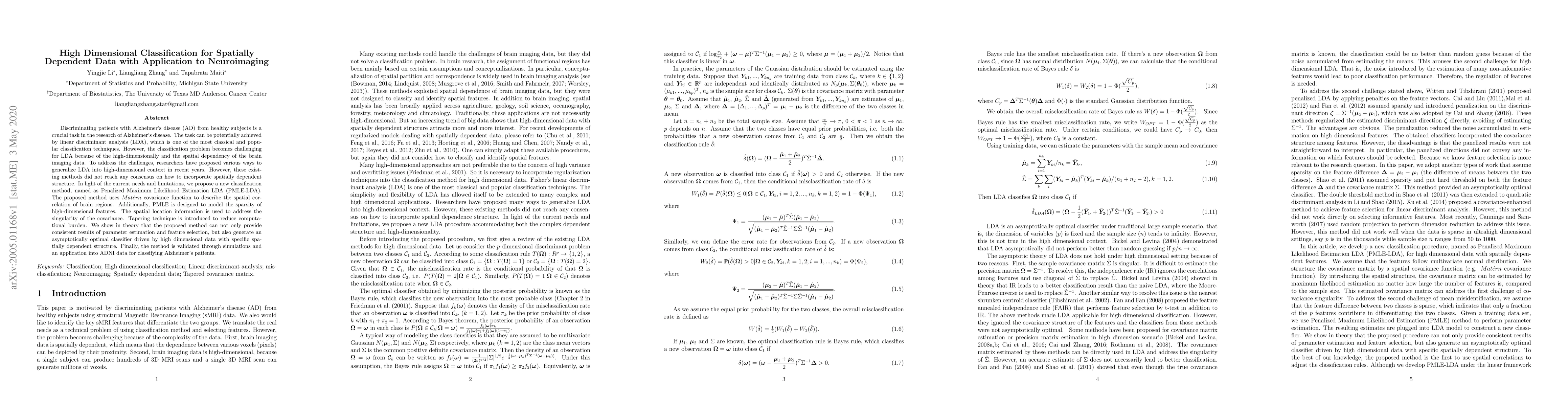 Discriminating patients with Alzheimer's disease (AD) from healthy subjects is a crucial task in the research of Alzheimer's disease. The task can be potentially achieved by linear discriminant analysis (LDA), which is one of the most classical and popular classification techniques. However, the classification problem becomes challenging for LDA because of the high-dimensionally and the spatial dependency of the brain imaging data. To address the challenges, researchers have proposed various ways to generalize LDA into high-dimensional context in recent years. However, these existing methods did not reach any consensus on how to incorporate spatially dependent structure. In light of the current needs and limitations, we propose a new classification method, named as Penalized Maximum Likelihood Estimation LDA (PMLE-LDA). The proposed method uses $Mat\acute{e}rn$ covariance function to describe the spatial correlation of brain regions. Additionally, PMLE is designed to model the sparsity of high-dimensional features. The spatial location information is used to address the singularity of the covariance. Tapering technique is introduced to reduce computational burden. We show in theory that the proposed method can not only provide consistent results of parameter estimation and feature selection, but also generate an asymptotically optimal classifier driven by high dimensional data with specific spatially dependent structure. Finally, the method is validated through simulations and an application into ADNI data for classifying Alzheimer's patients.