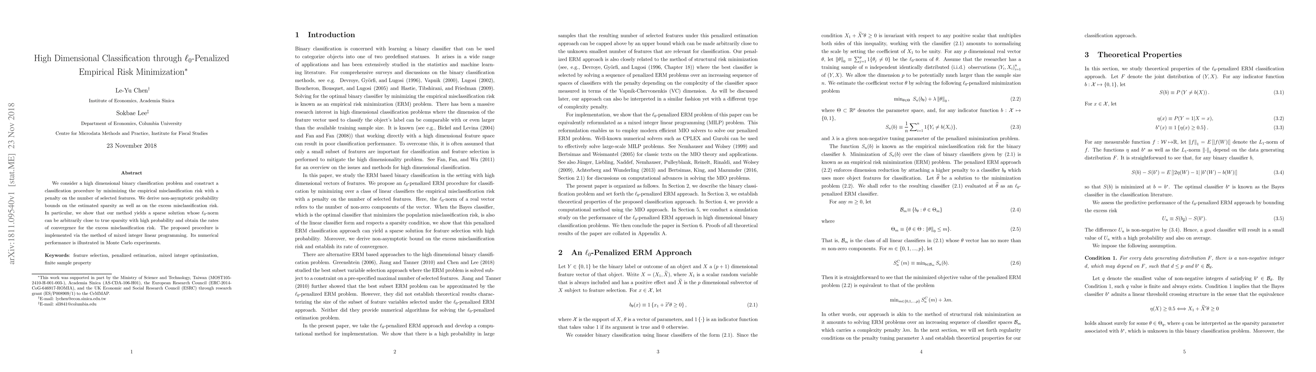 We consider a high dimensional binary classification problem and construct a classification procedure by minimizing the empirical misclassification risk with a penalty on the number of selected features. We derive non-asymptotic probability bounds on the estimated sparsity as well as on the excess misclassification risk. In particular, we show that our method yields a sparse solution whose l0-norm can be arbitrarily close to true sparsity with high probability and obtain the rates of convergence for the excess misclassification risk. The proposed procedure is implemented via the method of mixed integer linear programming. Its numerical performance is illustrated in Monte Carlo experiments.