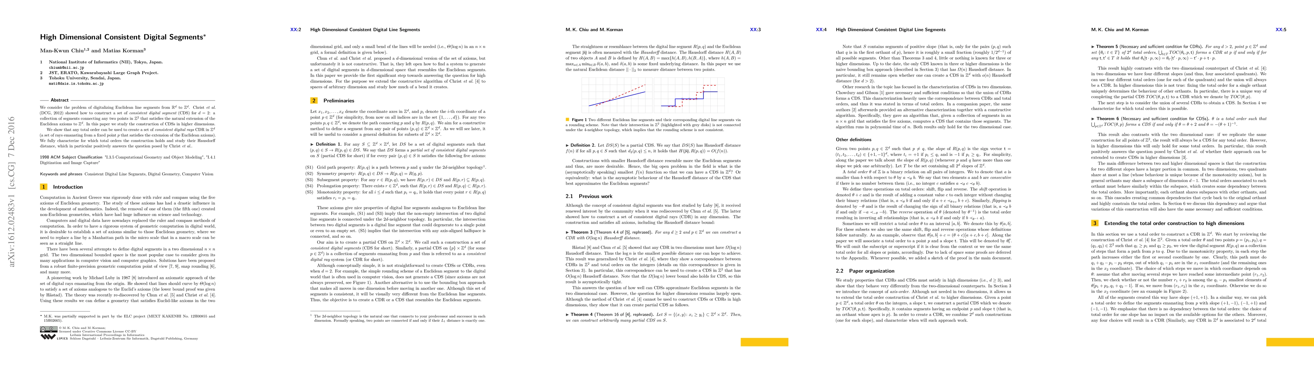We consider the problem of digitalizing Euclidean line segments from $\mathbb{R}^d$ to $\mathbb{Z}^d$. Christ {\em et al.} (DCG, 2012) showed how to construct a set of {\em consistent digital segment} (CDS) for $d=2$: a collection of segments connecting any two points in $\mathbb{Z}^2$ that satisfies the natural extension of the Euclidean axioms to $\mathbb{Z}^d$. In this paper we study the construction of CDSs in higher dimensions. We show that any total order can be used to create a set of {\em consistent digital rays} CDR in $\mathbb{Z}^d$ (a set of rays emanating from a fixed point $p$ that satisfies the extension of the Euclidean axioms). We fully characterize for which total orders the construction holds and study their Hausdorff distance, which in particular positively answers the question posed by Christ {\em et al.}.