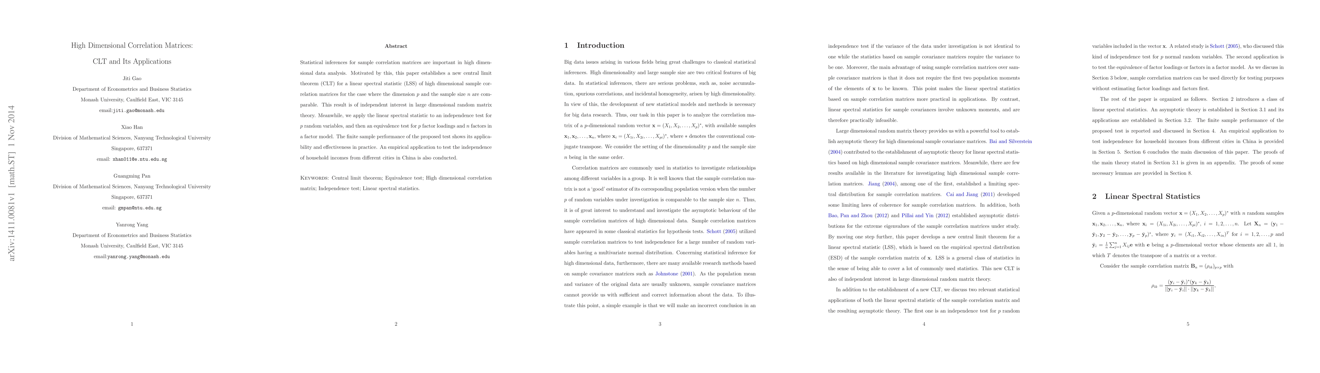 This paper establishes a new central limit theorem for linear spectral statistics of high-dimensional sample correlation matrices, demonstrating its application in independence tests and factor model equivalence tests. The proposed methods show practical effectiveness, as evidenced by an empirical test on household incomes across cities in China.