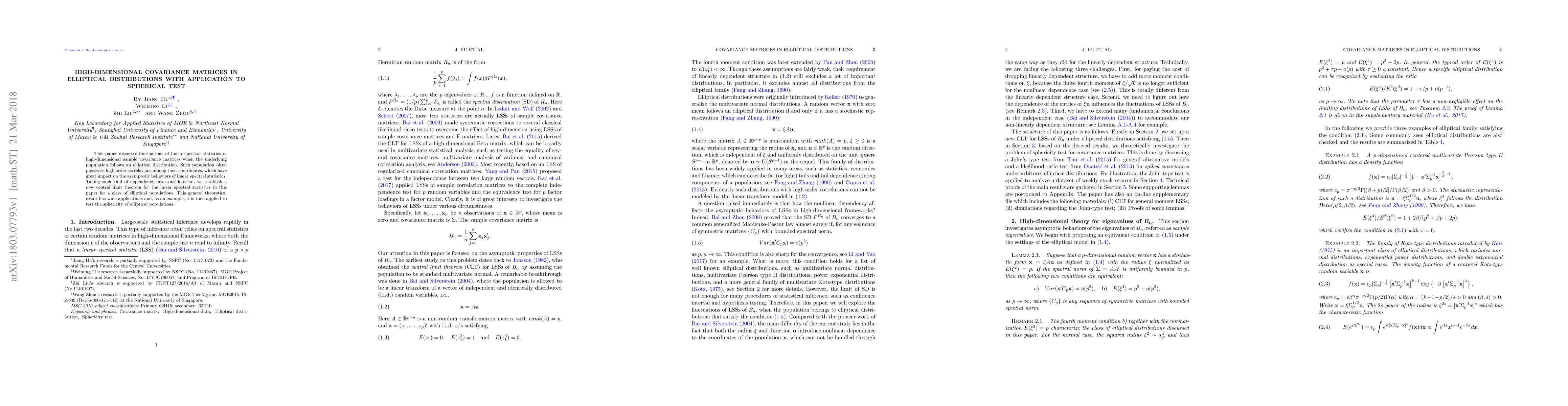 This paper establishes a new central limit theorem for linear spectral statistics of high-dimensional sample covariance matrices from elliptical distributions, considering their high-order correlations. It applies this result to test the sphericity of elliptical populations.