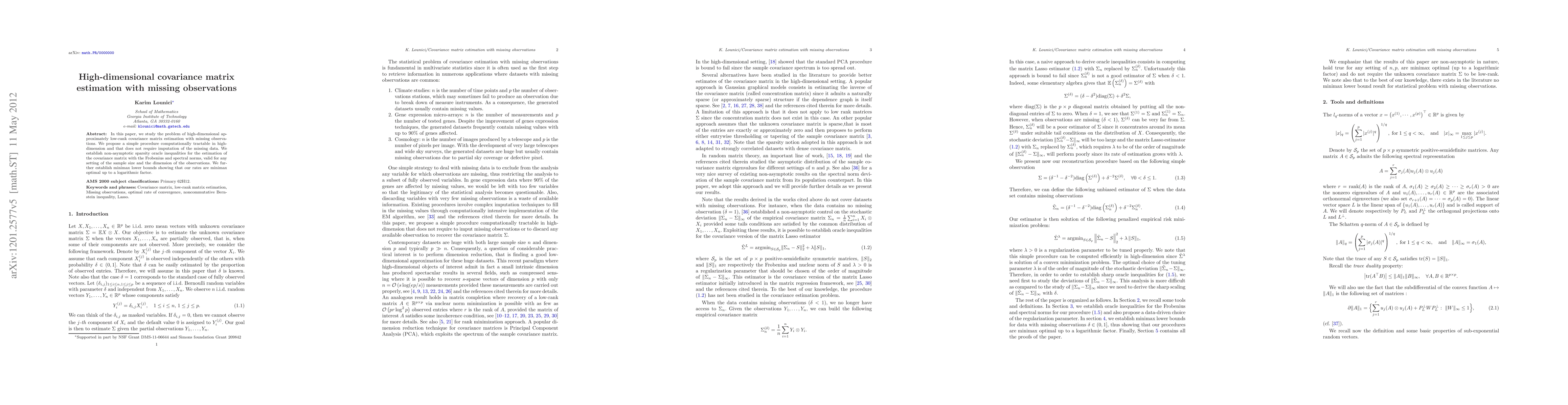 This paper proposes a computationally efficient method for estimating high-dimensional, approximately low-rank covariance matrices with missing observations, without requiring data imputation. It establishes non-asymptotic sparsity oracle inequalities and proves minimax optimality of the proposed method.