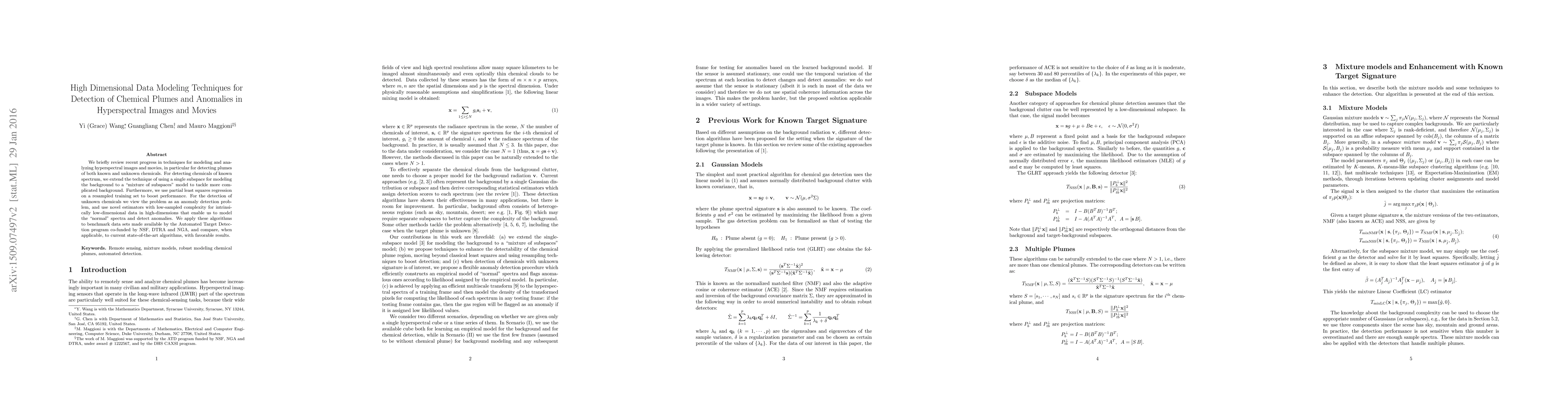 We briefly review recent progress in techniques for modeling and analyzing hyperspectral images and movies, in particular for detecting plumes of both known and unknown chemicals. For detecting chemicals of known spectrum, we extend the technique of using a single subspace for modeling the background to a "mixture of subspaces" model to tackle more complicated background. Furthermore, we use partial least squares regression on a resampled training set to boost performance. For the detection of unknown chemicals we view the problem as an anomaly detection problem, and use novel estimators with low-sampled complexity for intrinsically low-dimensional data in high-dimensions that enable us to model the "normal" spectra and detect anomalies. We apply these algorithms to benchmark data sets made available by the Automated Target Detection program co-funded by NSF, DTRA and NGA, and compare, when applicable, to current state-of-the-art algorithms, with favorable results.
