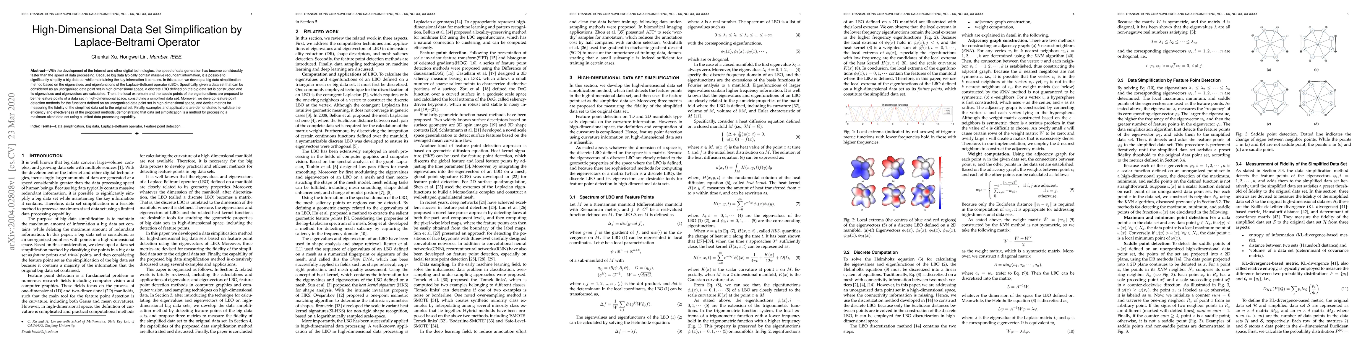 This paper introduces a method to simplify high-dimensional data sets using the Laplace-Beltrami operator. It constructs a discrete LBO for the data set, identifies key feature points via eigenfunctions' local extremum and saddle points, and validates the approach with examples. The method aims to process large data sets efficiently with limited processing capabilities.