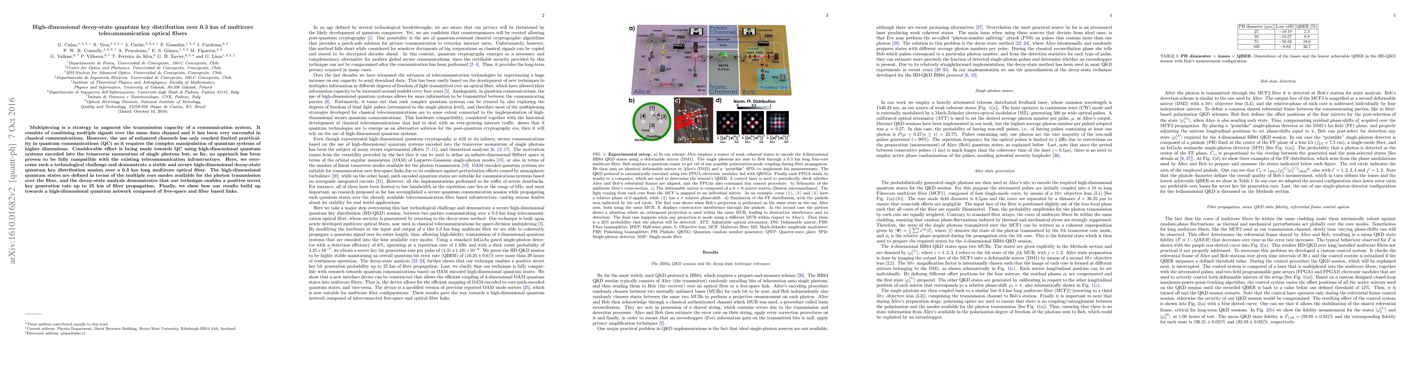Multiplexing is a strategy to augment the transmission capacity of a communication system. It consists of combining multiple signals over the same data channel and it has been very successful in classical communications. However, the use of enhanced channels has only reached limited practicality in quantum communications (QC) as it requires the complex manipulation of quantum systems of higher dimensions. Considerable effort is being made towards QC using high-dimensional quantum systems encoded into the transverse momentum of single photons but, so far, no approach has been proven to be fully compatible with the existing telecommunication infrastructure. Here, we overcome such a technological challenge and demonstrate a stable and secure high-dimensional decoy-state quantum key distribution session over a 0.3 km long multicore optical fiber. The high-dimensional quantum states are defined in terms of the multiple core modes available for the photon transmission over the fiber, and the decoy-state analysis demonstrates that our technique enables a positive secret key generation rate up to 25 km of fiber propagation. Finally, we show how our results build up towards a high-dimensional quantum network composed of free-space and fiber based links