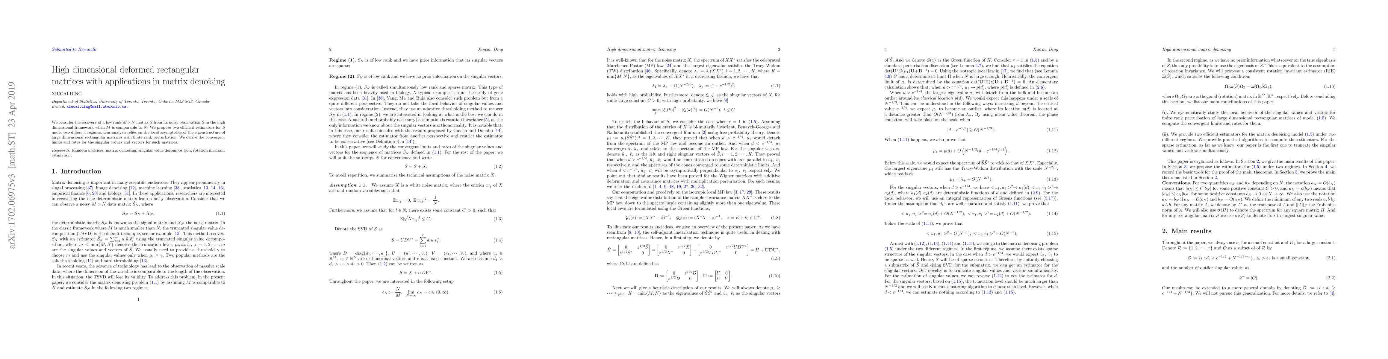 This paper proposes two consistent estimators for recovering a low-rank matrix from noisy observations, focusing on regimes where the matrix dimensions are comparable. The study analyzes the local behavior of high-dimensional deformed rectangular matrices and provides convergence limits and rates for their singular values and vectors.