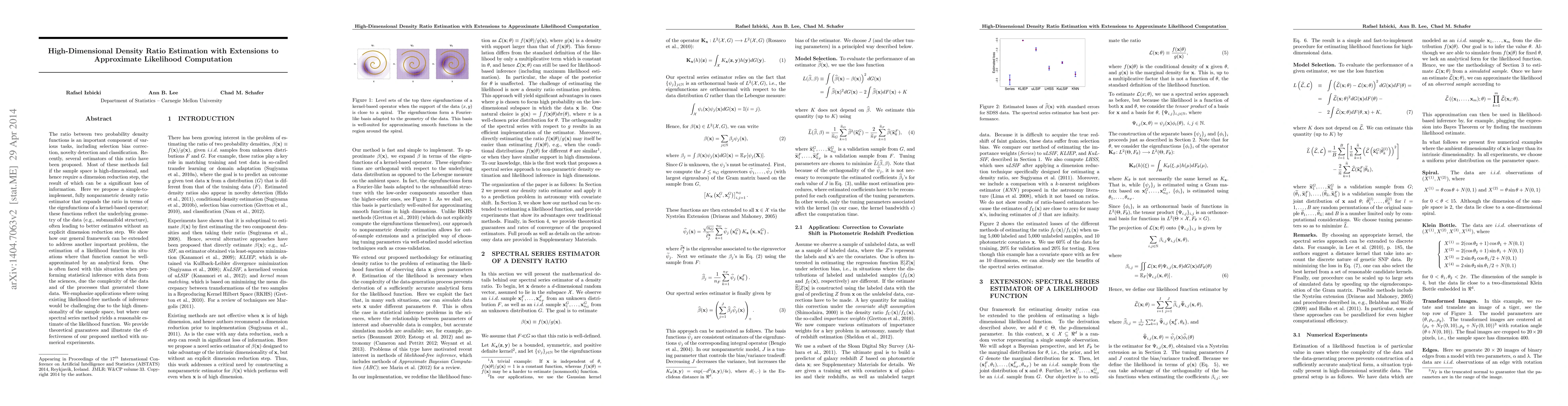 The ratio between two probability density functions is an important component of various tasks, including selection bias correction, novelty detection and classification. Recently, several estimators of this ratio have been proposed. Most of these methods fail if the sample space is high-dimensional, and hence require a dimension reduction step, the result of which can be a significant loss of information. Here we propose a simple-to-implement, fully nonparametric density ratio estimator that expands the ratio in terms of the eigenfunctions of a kernel-based operator; these functions reflect the underlying geometry of the data (e.g., submanifold structure), often leading to better estimates without an explicit dimension reduction step. We show how our general framework can be extended to address another important problem, the estimation of a likelihood function in situations where that function cannot be well-approximated by an analytical form. One is often faced with this situation when performing statistical inference with data from the sciences, due the complexity of the data and of the processes that generated those data. We emphasize applications where using existing likelihood-free methods of inference would be challenging due to the high dimensionality of the sample space, but where our spectral series method yields a reasonable estimate of the likelihood function. We provide theoretical guarantees and illustrate the effectiveness of our proposed method with numerical experiments.