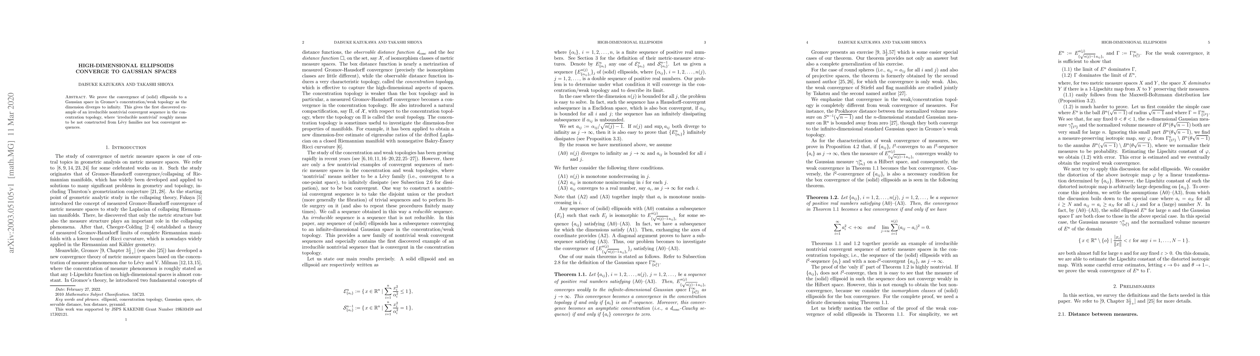 We prove the convergence of (solid) ellipsoids to a Gaussian space in Gromov's concentration/weak topology as the dimension diverges to infinity. This gives the first discovered example of an irreducible nontrivial convergent sequence in the concentration topology, where 'irreducible nontrivial' roughly means to be not constructed from Levy families nor box convergent sequences.