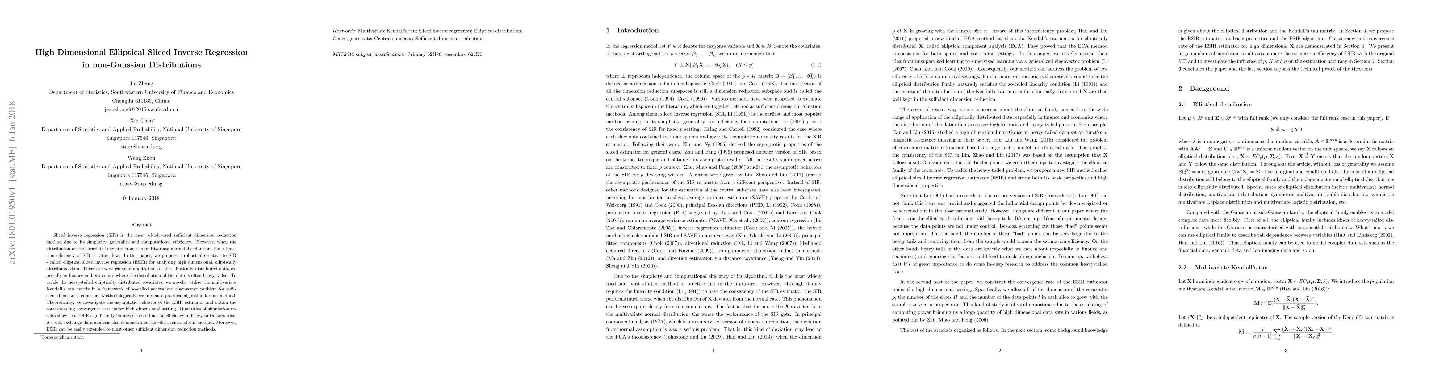 This paper proposes elliptical sliced inverse regression (ESIR) as a robust alternative to sliced inverse regression for high dimensional data with elliptically distributed covariates, especially in heavy-tailed scenarios like finance. The method utilizes the multivariate Kendall's tau matrix and demonstrates improved efficiency through simulations and a stock exchange data analysis.