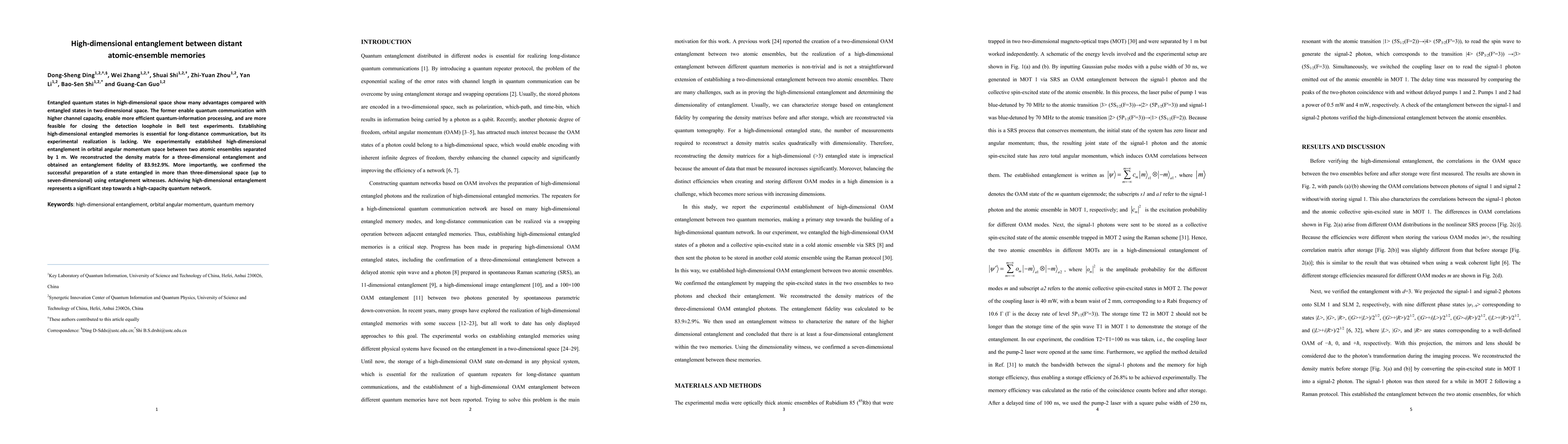 This paper experimentally establishes high-dimensional entanglement between two distant atomic ensembles, achieving a fidelity of 83.9% for three-dimensional entanglement and confirming entanglement in up to seven-dimensional space, marking a significant advancement towards high-capacity quantum networks.