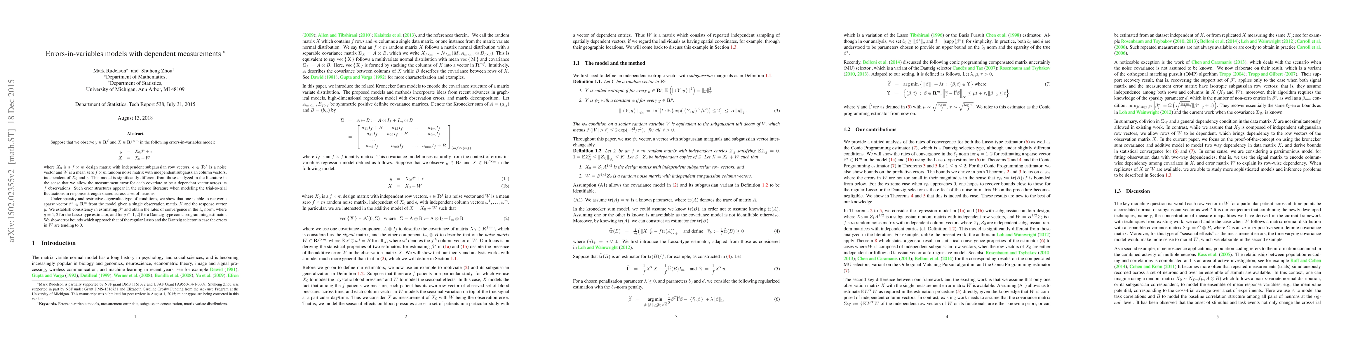 Suppose that we observe $y \in \mathbb{R}^f$ and $X \in \mathbb{R}^{f \times m}$ in the following errors-in-variables model: \begin{eqnarray*} y & = & X_0 \beta^* + \epsilon \\ X & = & X_0 + W \end{eqnarray*} where $X_0$ is a $f \times m$ design matrix with independent subgaussian row vectors, $\epsilon \in \mathbb{R}^f$ is a noise vector and $W$ is a mean zero $f \times m$ random noise matrix with independent subgaussian column vectors, independent of $X_0$ and $\epsilon$. This model is significantly different from those analyzed in the literature in the sense that we allow the measurement error for each covariate to be a dependent vector across its $f$ observations. Such error structures appear in the science literature when modeling the trial-to-trial fluctuations in response strength shared across a set of neurons. Under sparsity and restrictive eigenvalue type of conditions, we show that one is able to recover a sparse vector $\beta^* \in \mathbb{R}^m$ from the model given a single observation matrix $X$ and the response vector $y$. We establish consistency in estimating $\beta^*$ and obtain the rates of convergence in the $\ell_q$ norm, where $q = 1, 2$ for the Lasso-type estimator, and for $q \in [1, 2]$ for a Dantzig-type conic programming estimator. We show error bounds which approach that of the regular Lasso and the Dantzig selector in case the errors in $W$ are tending to 0.