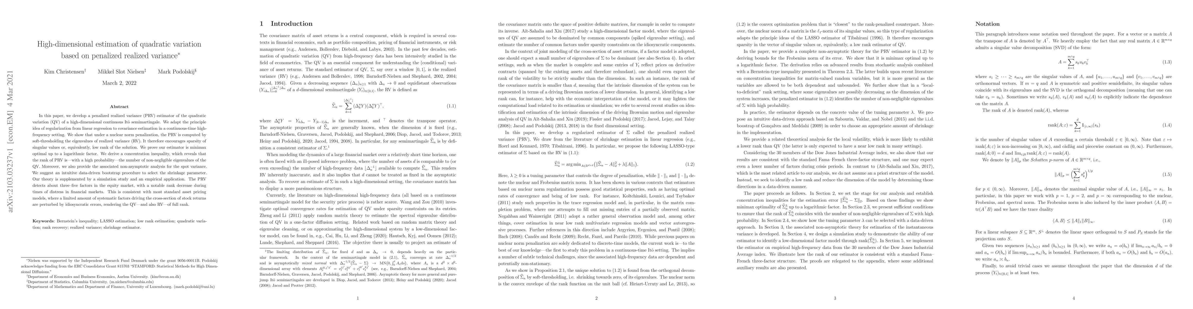 In this paper, we develop a penalized realized variance (PRV) estimator of the quadratic variation (QV) of a high-dimensional continuous It\^{o} semimartingale. We adapt the principle idea of regularization from linear regression to covariance estimation in a continuous-time high-frequency setting. We show that under a nuclear norm penalization, the PRV is computed by soft-thresholding the eigenvalues of realized variance (RV). It therefore encourages sparsity of singular values or, equivalently, low rank of the solution. We prove our estimator is minimax optimal up to a logarithmic factor. We derive a concentration inequality, which reveals that the rank of PRV is -- with a high probability -- the number of non-negligible eigenvalues of the QV. Moreover, we also provide the associated non-asymptotic analysis for the spot variance. We suggest an intuitive data-driven bootstrap procedure to select the shrinkage parameter. Our theory is supplemented by a simulation study and an empirical application. The PRV detects about three-five factors in the equity market, with a notable rank decrease during times of distress in financial markets. This is consistent with most standard asset pricing models, where a limited amount of systematic factors driving the cross-section of stock returns are perturbed by idiosyncratic errors, rendering the QV -- and also RV -- of full rank.