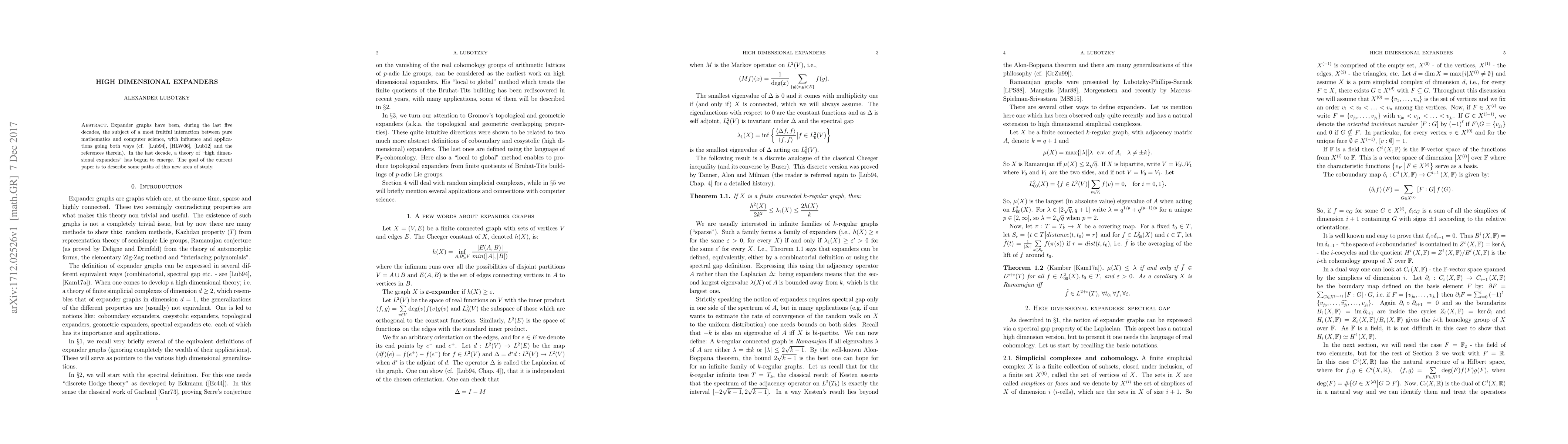 Expander graphs have been, during the last five decades, the subject of a most fruitful interaction between pure mathematics and computer science, with influence and applications going both ways (cf. [Lub94], [HLW06], [Lub12] and the references therein). In the last decade, a theory of "high dimensional expanders" has begun to emerge. The goal of the current paper is to describe some paths of this new area of study.