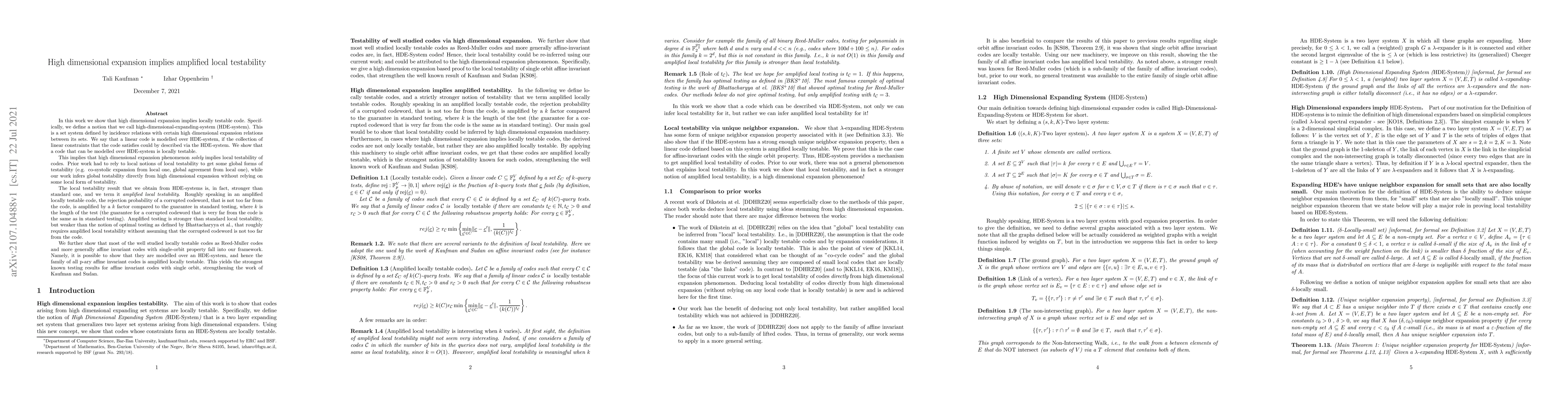 The paper employs a mathematical framework involving high-dimensional expansion systems (HDE-systems) to establish local testability of codes. It introduces a new notion called HDE-system, which is a set system defined by incidence relations with specific high-dimensional expansion relations between its sets. The authors show that a code modeled over an HDE-system is locally testable, leading to a stronger result called amplified local testability.