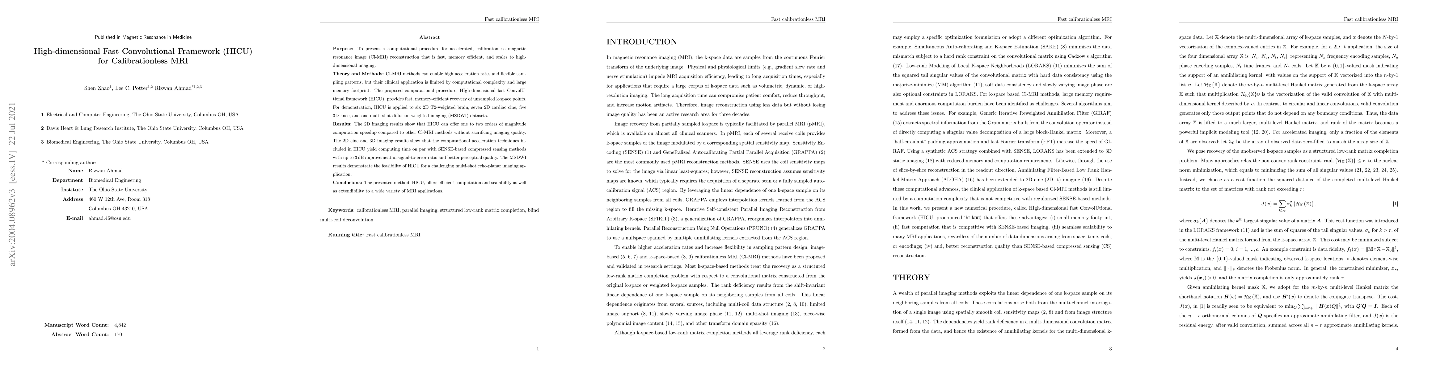 Purpose: To present a computational procedure for accelerated, calibrationless magnetic resonance image (Cl-MRI) reconstruction that is fast, memory efficient, and scales to high-dimensional imaging. Theory and Methods: Cl-MRI methods can enable high acceleration rates and flexible sampling patterns, but their clinical application is limited by computational complexity and large memory footprint. The proposed computational procedure, HIgh-dimensional fast ConvolU-tional framework (HICU), provides fast, memory-efficient recovery of unsampled k-space points. For demonstration, HICU is applied to six 2D T2-weighted brain, seven 2D cardiac cine, five 3D knee, and one multi-shot diffusion weighted imaging (MSDWI) datasets. Results: The 2D imaging results show that HICU can offer one to two orders of magnitude computation speedup compared to other Cl-MRI methods without sacrificing imaging quality. The 2D cine and 3D imaging results show that the computational acceleration techniques included in HICU yield computing time on par with SENSE-based compressed sensing methods with up to 3 dB improvement in signal-to-error ratio and better perceptual quality. The MSDWI results demonstrate the feasibility of HICU for a challenging multi-shot echo-planar imaging application. Conclusions: The presented method, HICU, offers efficient computation and scalability as well as extendibility to a wide variety of MRI applications.