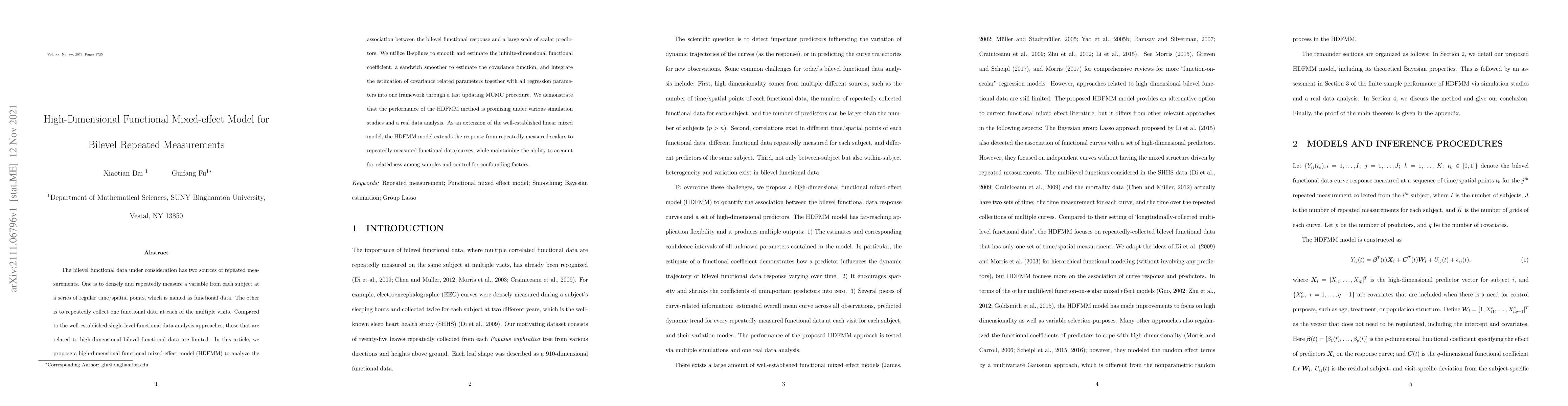 A new statistical model is proposed to analyze high-dimensional functional data with repeated measurements, extending linear mixed models to handle complex relationships between multiple predictors and functional responses.