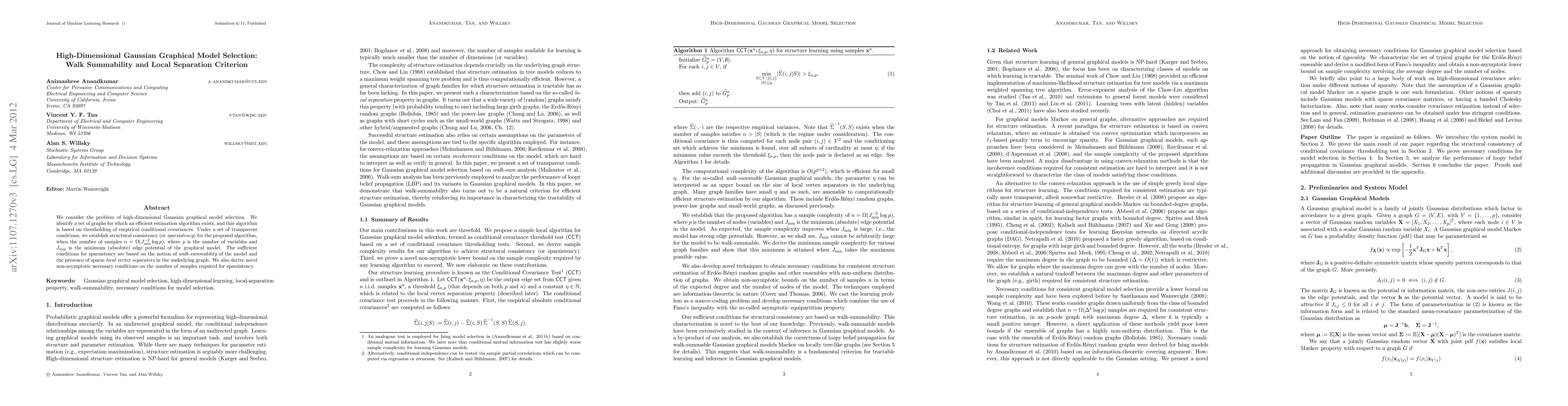 We consider the problem of high-dimensional Gaussian graphical model selection. We identify a set of graphs for which an efficient estimation algorithm exists, and this algorithm is based on thresholding of empirical conditional covariances. Under a set of transparent conditions, we establish structural consistency (or sparsistency) for the proposed algorithm, when the number of samples n=omega(J_{min}^{-2} log p), where p is the number of variables and J_{min} is the minimum (absolute) edge potential of the graphical model. The sufficient conditions for sparsistency are based on the notion of walk-summability of the model and the presence of sparse local vertex separators in the underlying graph. We also derive novel non-asymptotic necessary conditions on the number of samples required for sparsistency.
