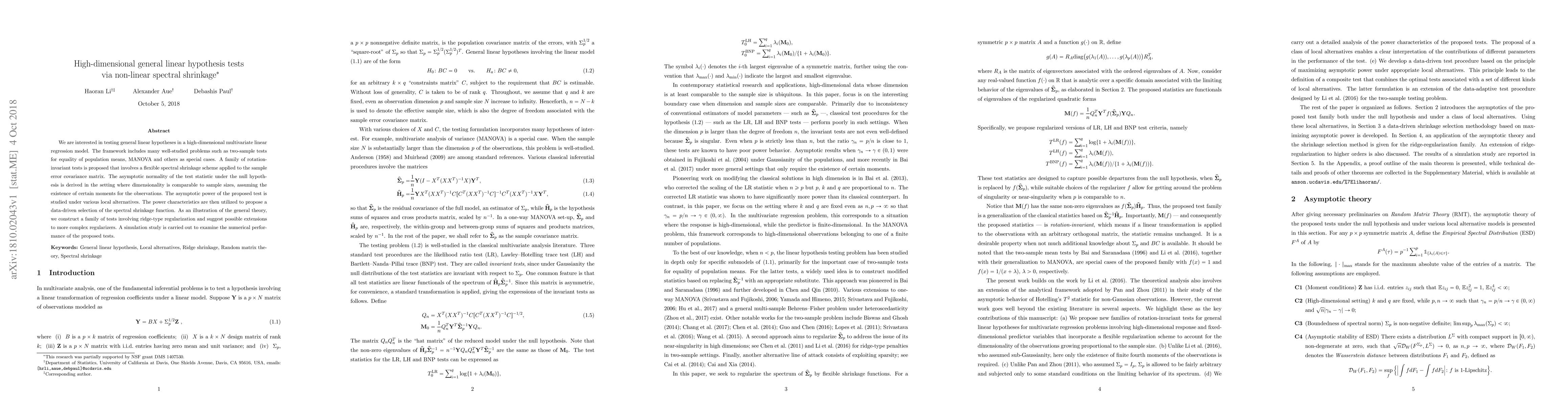 We are interested in testing general linear hypotheses in a high-dimensional multivariate linear regression model. The framework includes many well-studied problems such as two-sample tests for equality of population means, MANOVA and others as special cases. A family of rotation-invariant tests is proposed that involves a flexible spectral shrinkage scheme applied to the sample error covariance matrix. The asymptotic normality of the test statistic under the null hypothesis is derived in the setting where dimensionality is comparable to sample sizes, assuming the existence of certain moments for the observations. The asymptotic power of the proposed test is studied under various local alternatives. The power characteristics are then utilized to propose a data-driven selection of the spectral shrinkage function. As an illustration of the general theory, we construct a family of tests involving ridge-type regularization and suggest possible extensions to more complex regularizers. A simulation study is carried out to examine the numerical performance of the proposed tests.