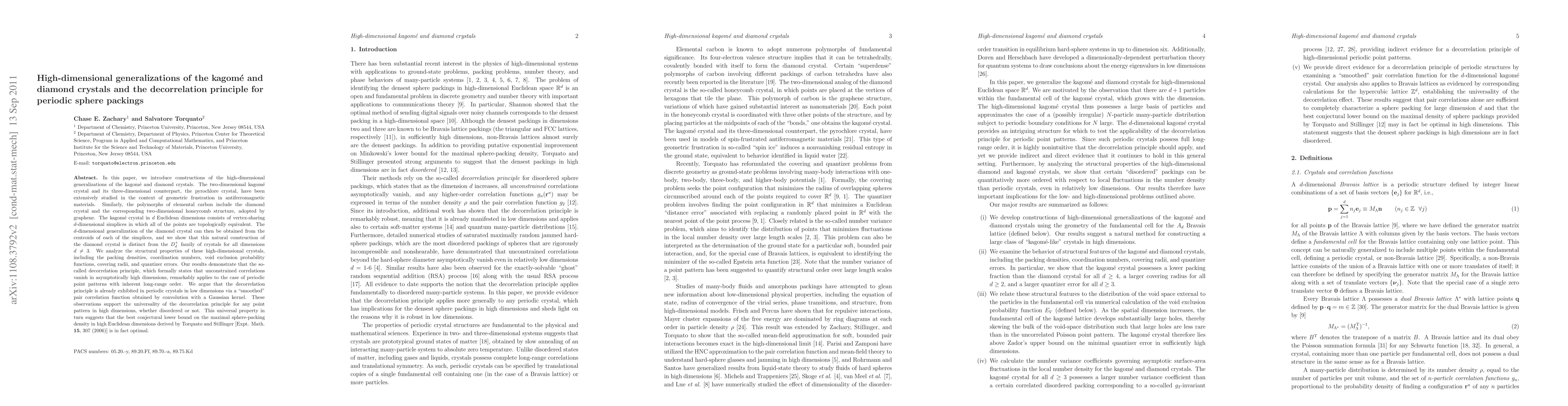 In this paper, we introduce constructions of the high-dimensional generalizations of the kagome and diamond crystals. The two-dimensional kagome crystal and its three-dimensional counterpart, the pyrochlore crystal, have been extensively studied in the context of geometric frustration in antiferromagnetic materials. Similarly, the polymorphs of elemental carbon include the diamond crystal and the corresponding two-dimensional honeycomb structure, adopted by graphene. The kagome crystal in d Euclidean dimensions consists of vertex-sharing d-dimensional simplices in which all of the points are topologically equivalent. The d-dimensional generalization of the diamond crystal can then be obtained from the centroids of each of the simplices, and we show that this natural construction of the diamond crystal is distinct from the D_d^+ family of crystals for all dimensions d\neq 3. We analyze the structural properties of these high-dimensional crystals, including the packing densities, coordination numbers, void exclusion probability functions, covering radii, and quantizer errors. Our results demonstrate that the so-called decorrelation principle, which formally states that unconstrained correlations vanish in asymptotically high dimensions, remarkably applies to the case of periodic point patterns with inherent long-range order. We show that the decorrelation principle is already exhibited in periodic crystals in low dimensions via a "smoothed" pair correlation function obtained by convolution with a Gaussian kernel. These observations support the universality of the decorrelation principle for any point pattern in high dimensions, whether disordered or not. This universal property in turn suggests that the best conjectural lower bound on the maximal sphere-packing density in high Euclidean dimensions derived by Torquato and Stillinger [Expt. Math. 15, 307 (2006)] is in fact optimal.