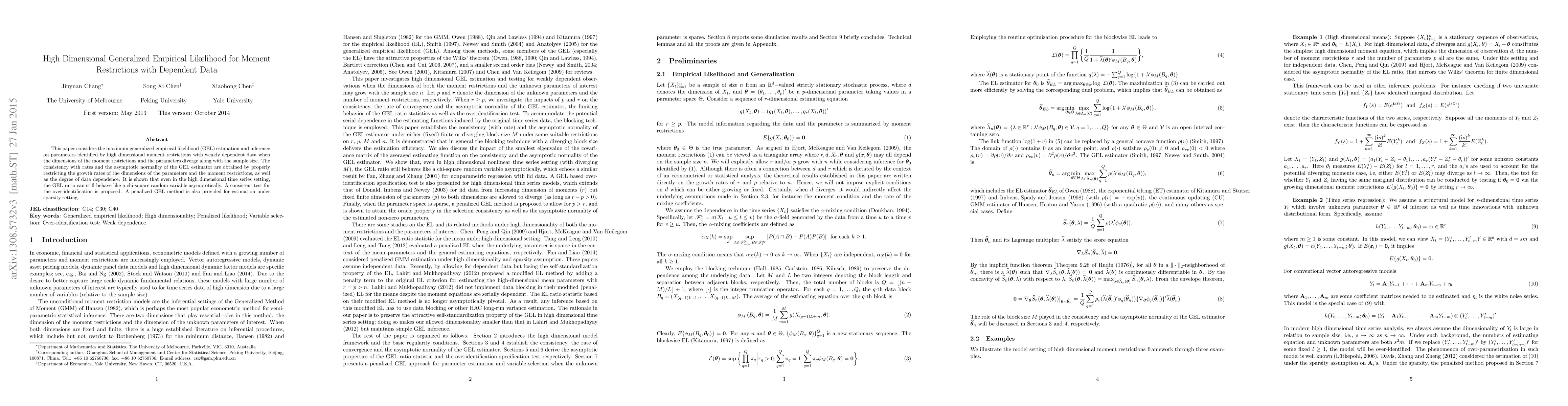This paper develops maximum generalized empirical likelihood (GEL) estimation and inference for high dimensional moment restrictions with weakly dependent data, showing consistency and asymptotic normality under specific growth rate conditions. It proposes a consistent test for over-identification and a penalized GEL method for sparse settings.