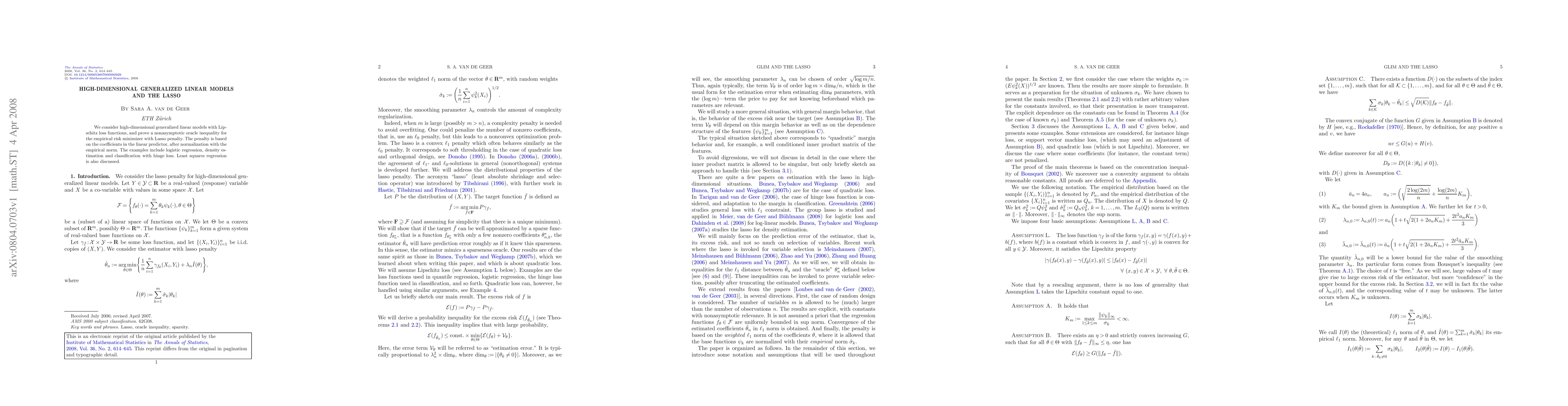 This paper proves a nonasymptotic oracle inequality for high-dimensional generalized linear models with Lasso penalty, demonstrating its effectiveness in logistic regression, density estimation, classification with hinge loss, and least squares regression. The Lasso penalty normalizes coefficients based on the empirical norm.